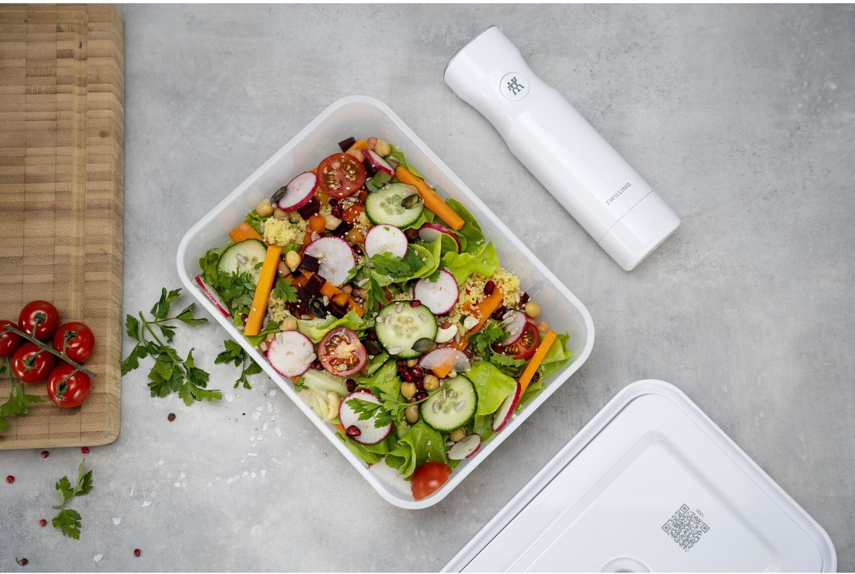 - Culinary World App Integration: Connect your vacuum storage with the ZWILLING Culinary World App via the QR code on the lids for efficient food tracking and shelf-life management. The app provides insights into how long your vacuum-sealed food can be kept and offers a reminder function to notify you when it's time to enjoy your stored food. It also includes recipes, explanatory videos, and a convenient shopping list feature.