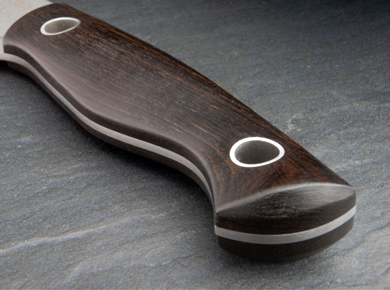 Our Boker Saga chef's knife series - handcrafted by our manufactory in Solingen - raises the bar and brings the topic of "cutting in the kitchen" to a new level. Our decades of experience in the outdoor knife world coupled with the ingenuity and creativity of Danish knifemaker Jesper Voxnaes were incorporated into the concept and design of Saga in an effort to achieve a new level of performance in terms of ergonomics and cutting technology. The carefully orchestrated transfer of this joint know-how into the culinary field is proof that working with Boker Saga will be an entirely unique experience. The softly swung grips are fabricated from exclusive certified imported grenadilla wood. With its high hardness and density, grenadilla wood is a fixture in the European wood instrument making field. The successful ergonomics already become apparent when the Boker Sage knife series is first handled: every curve, every bend in the line nestles itself into place on the hand, conveying absolute control and an exceptional cutting experience. The swallow-tail-shaped flare of the pommel on the larger models enhances grip security.