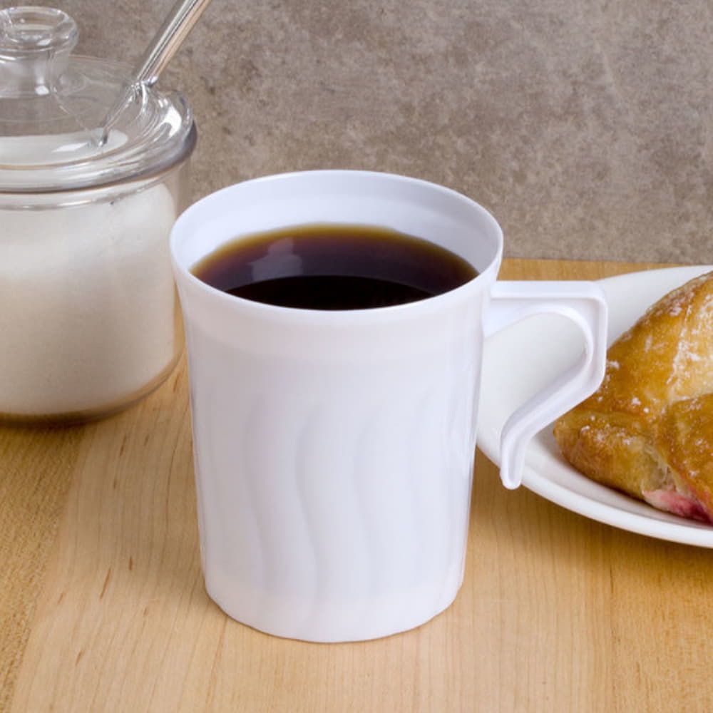 With a height of 4 3/4", these mugs are designed to complement various table settings, adding an element of sophistication and charm. Their pristine white color not only complements any setting but also highlights the beverages served within, adding to the overall visual appeal of the presentation. The durable plastic construction of these mugs provides the convenience of disposability without compromising on quality or aesthetics. This balance ensures a hassle-free solution for serving beverages at events or establishments, eliminating the concern of breakage associated with traditional china mugs. Each case contains 288 mugs, offering a substantial quantity that is ideal for larger gatherings, catering services, or businesses requiring high-volume beverage service. This quantity ensures an ample supply of elegant mugs, guaranteeing a consistent and refined presentation.