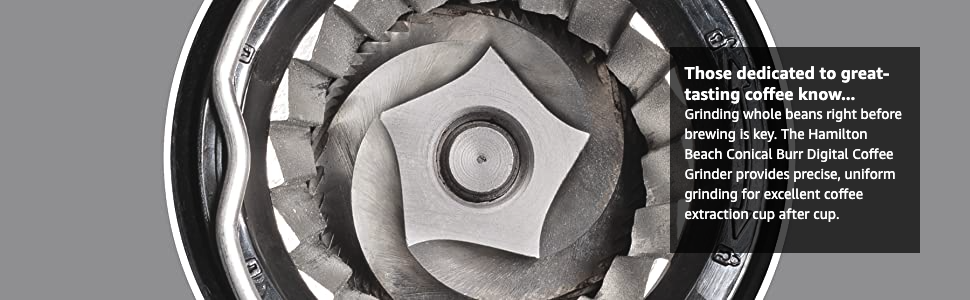 If you're dedicated to great-tasting coffee, grinding whole beans right before brewing is key. The Hamilton Beach® Conical Burr Digital Coffee Grinder provides precise, uniform grinding for excellent coffee extraction cup after cup. Its 39 grind selections let you expertly grind everything from coarsely ground French press to finely ground espresso. The hands-free automatic operation lets you grind just enough beans for the number of cups you want to brew and it turns off automatically so there's no need to tend the machine. If your brewing method calls for exact measurements, the built-in scale and easy-to-read digital screen let you automatically grind to a specific amount of ounces or grams. If you want total grinding control, the manual mode is ideal for you. With manual grinding, you control the timing yourself and even better, you have the option to grind directly into your own portafilter using the unique portafilter holder. Whichever grinding option you choose, the Hamilton Beach Professional Conical Burr Digital Coffee Grinder always provides precise control.