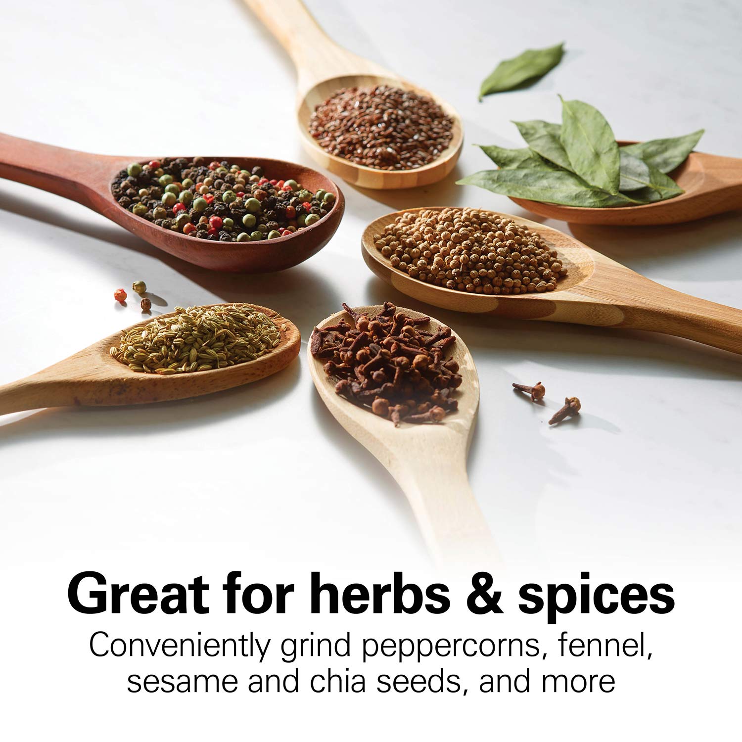 - Versatile: Ideal for grinding coffee beans as well as herbs and spices like peppercorns, fennel, sesame, flax, and chia seeds.