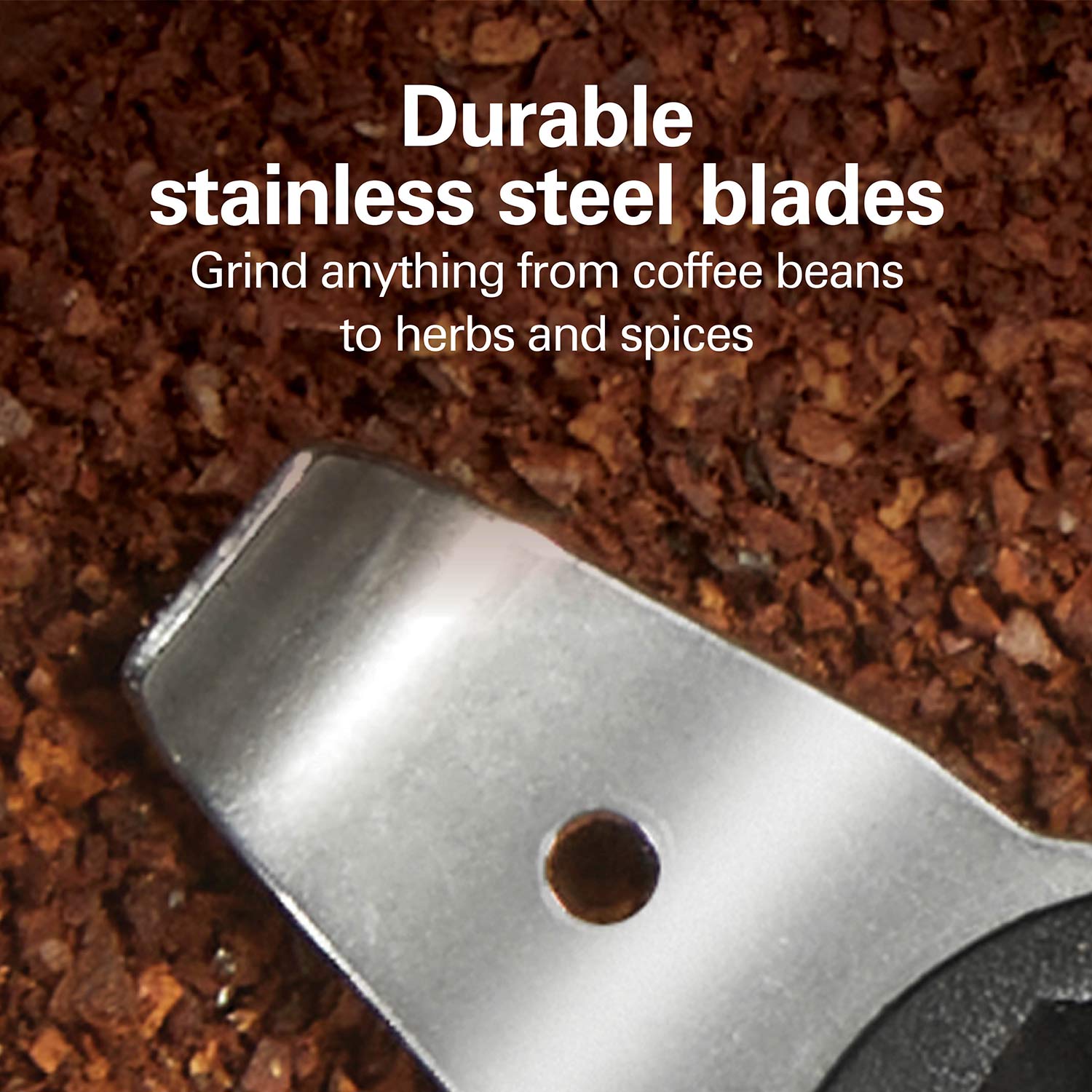 - Durable Stainless Steel Blades: Efficiently grind coffee beans, herbs, spices, and seeds with long-lasting stainless steel blades.