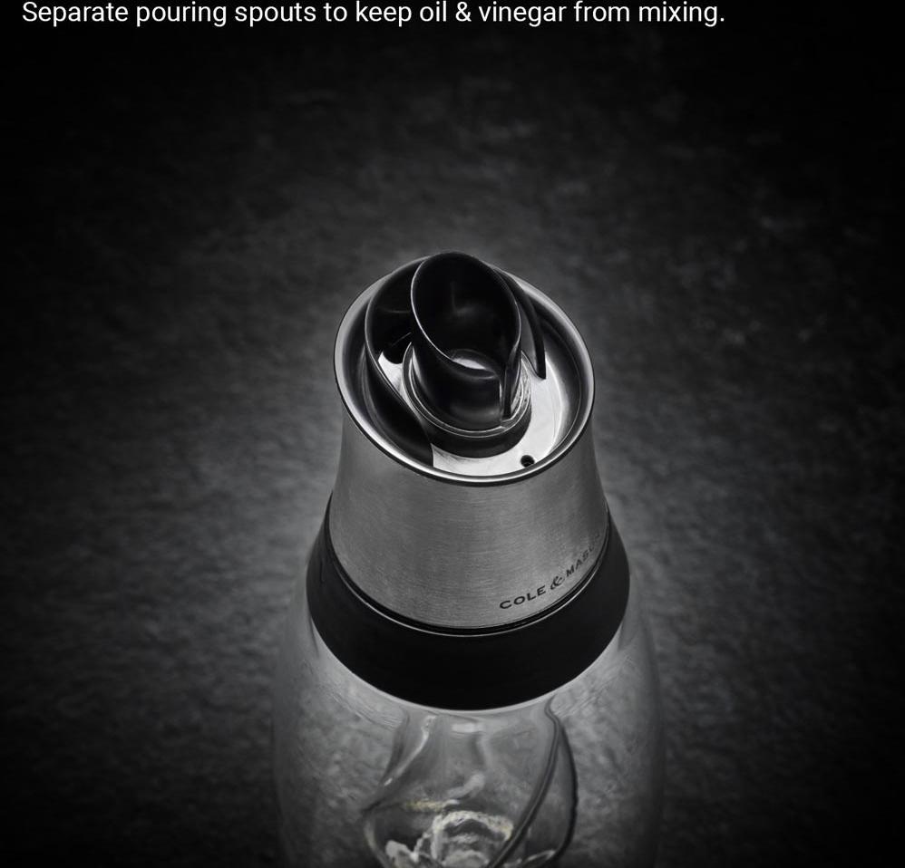 - Stainless steel spout and neck easily rotates to switch between oil, vinegar and closed positions