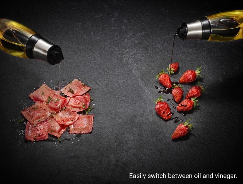 - 1.5 fluid oz. of vinegar and 14 fluid oz. oil capacity, suitable for a wide range of oils, vinegars and pourable sauces