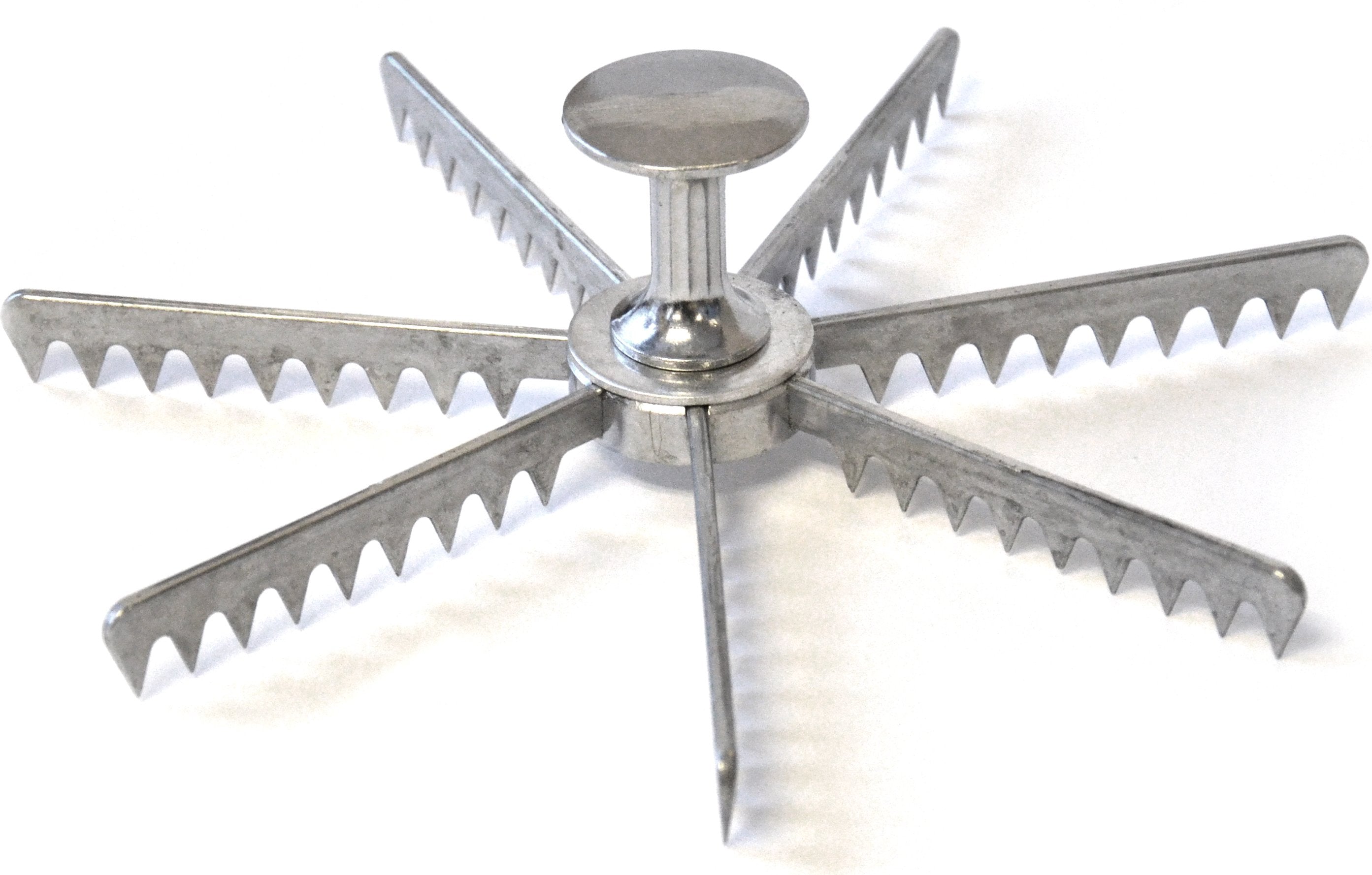 A neatly-sliced cake or pie shows the professionalism of your restaurant. Our aluminum slice pie marker helps you to evenly mark your pies and cakes. It help to ensure that you deliver the same portion of cake and pie every time. It features 9-teeth on each arm and a removable knob for easy cleaning and space-efficient storage. This marker is also great for quiche, pot pies etc.