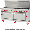 American Range, restaurant range size 72" x 32-1/2" x 56" Stainless steel front, sides, backriser, shelf and 6" adjustable legs. Removable full width drip pan. Choose 32,000 BTU/ hr. open burners with no-clog lift-o burner heads or 20,000 BTU/12" section griddle or a combo burner griddle. Griddle comes standard on left. Heavy-duty cast iron grates, 12" x 12". Burner knobs are cool to the touch, high temperature material. Two ovens: 35,000 BTU/hr. standard oven, 30,000 BTU/hr. for convection or innovection with porcelain interior and inside door panel, oven interior measures 26-1/2"W x 22-1/2"D x 13- 1/2"H. Oven thermostat adjusts from 250°F to 500°F. All ovens supplied with two racks. Oven door with a spring assisted, counterweight mechanism requiring no adjustment. Rear gas connection and pressure regulator.