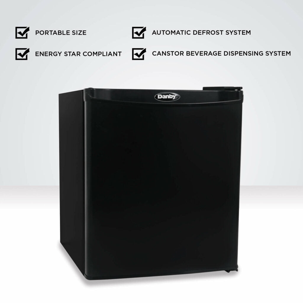 Ideal for small spaces like dorm rooms, wet bars, offices, or lunchrooms, the Danby 1.0 cu.ft. Black Compact Fridge offers the perfect blend of convenience and performance. With automatic defrost and a mechanical thermostat, this Energy Star® certified mini fridge is both efficient and easy to use. The patented CanStor® beverage dispenser keeps drinks organized and accessible, while integrated door shelving accommodates tall bottles. Designed with a recessed handle and reversible door hinge for left or right opening, this compact unit fits seamlessly into tight spaces and comes backed by a 12-month parts and labor warranty for added peace of mind.