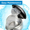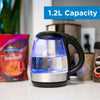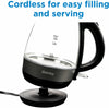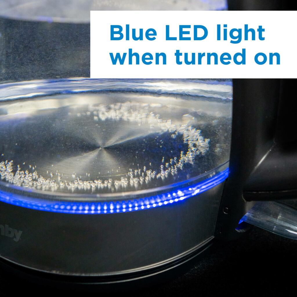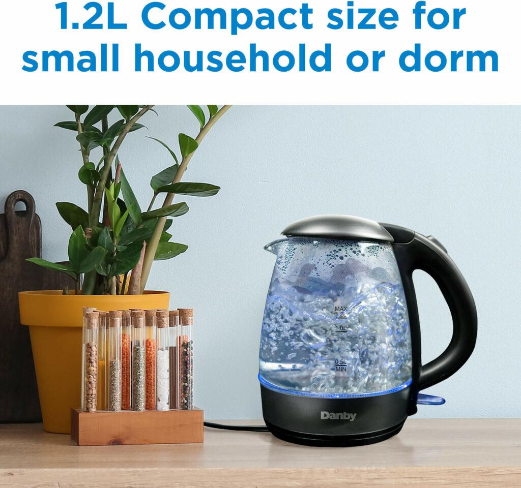 Brew your favorite hot beverages quickly and stylishly with the Danby 1.2 L Black Glass Kettle. Designed for compact kitchens, dorm rooms, or small households, this sleek kettle features a clear glass body with stainless steel accents and a soft blue LED light that illuminates while boiling. With 1500 watts of rapid boiling power, it heats water faster than a microwave and is perfect for tea, hot chocolate, instant coffee, or quick meals. The cordless design with a 360-degree swivel base ensures easy lifting, filling, and pouring, while built-in safety features like auto shut-off and boil-dry protection add peace of mind. Its compact footprint, anti-slip bottom, and easy-to-read water markings make it a reliable and convenient addition to any countertop.