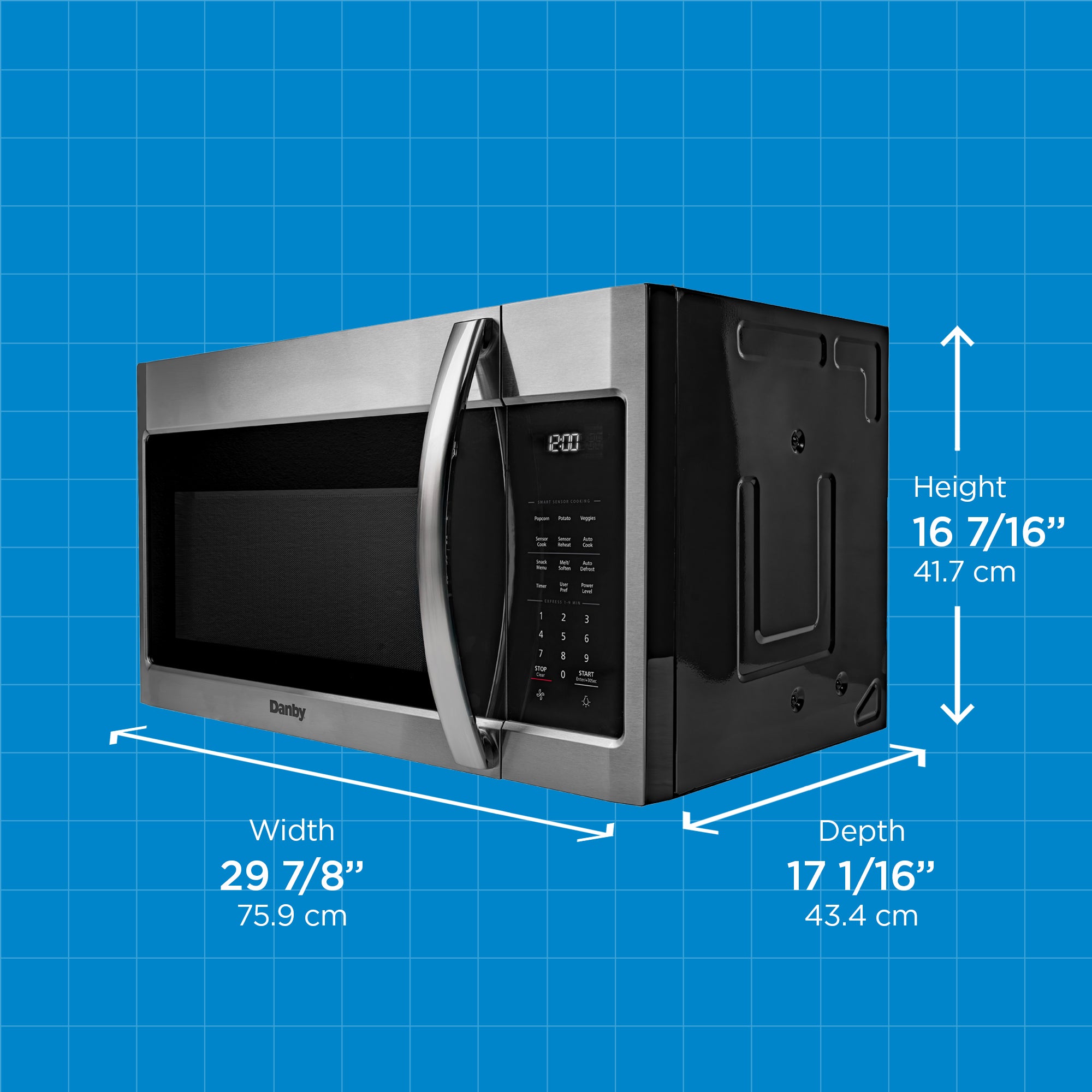 Upgrade your kitchen with the Danby 1.7 cu.ft. Over The Range Microwave Oven, combining modern design, smart technology, and powerful performance. With a large 1.7 cu.ft. capacity and 1000 watts of cooking power, this stainless steel microwave offers Sensor Cooking Controls that detect humidity levels and automatically stop cooking at the perfect time—ideal for meals like popcorn, frozen pizza, vegetables, and more. Additional features like Auto Defrost by weight or time, a Soften/Melt function for delicate items, and Express Cook buttons from 1 to 9 minutes make everyday cooking faster and easier. A child/control lock ensures safety, while the 2-speed ventilation fan efficiently clears steam and odors. Complete with a glass turntable for even cooking, this over-the-range microwave is a stylish and functional addition to any kitchen.