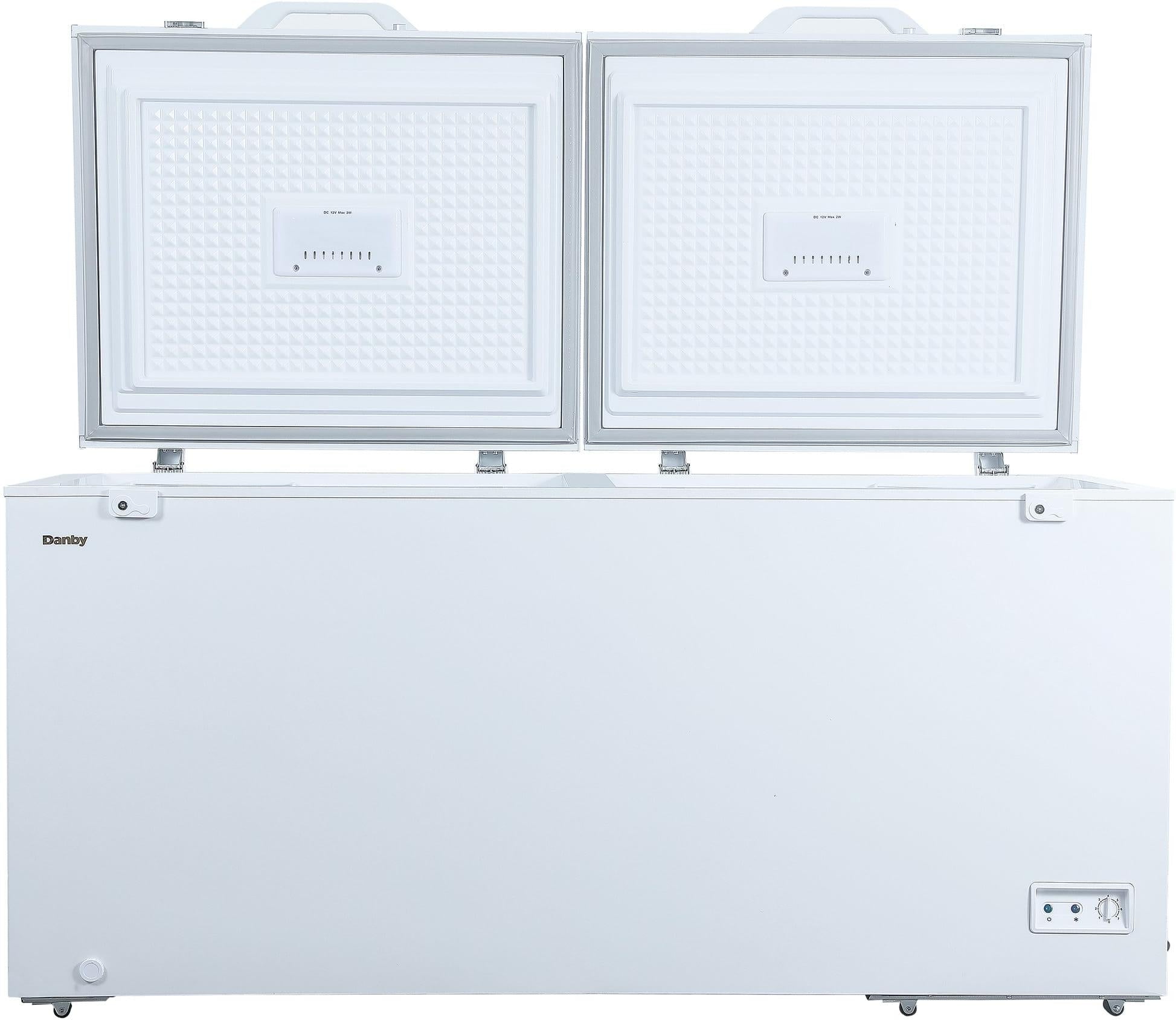 The Danby 21.2 cu. ft. Chest Freezer is the perfect solution for families or businesses needing high-capacity frozen food storage. With a massive 21.2 cu. ft. (594.6 L) capacity, this two-door freezer offers ample space for bulk items while keeping daily essentials within reach using two removable wire baskets. Its garage-ready design ensures consistent performance in temperatures ranging from 0°F to 110°F (-17°C to 43°C). The front-mounted mechanical thermostat allows for easy temperature adjustment, while the power-on indicator confirms continuous operation. LED lights under each lid make finding items easy, and the integrated lock and key provide added security. Four built-in rollers offer enhanced mobility, and the freezer is backed by an industry-leading 5-year parts and labor in-home warranty for complete peace of mind.