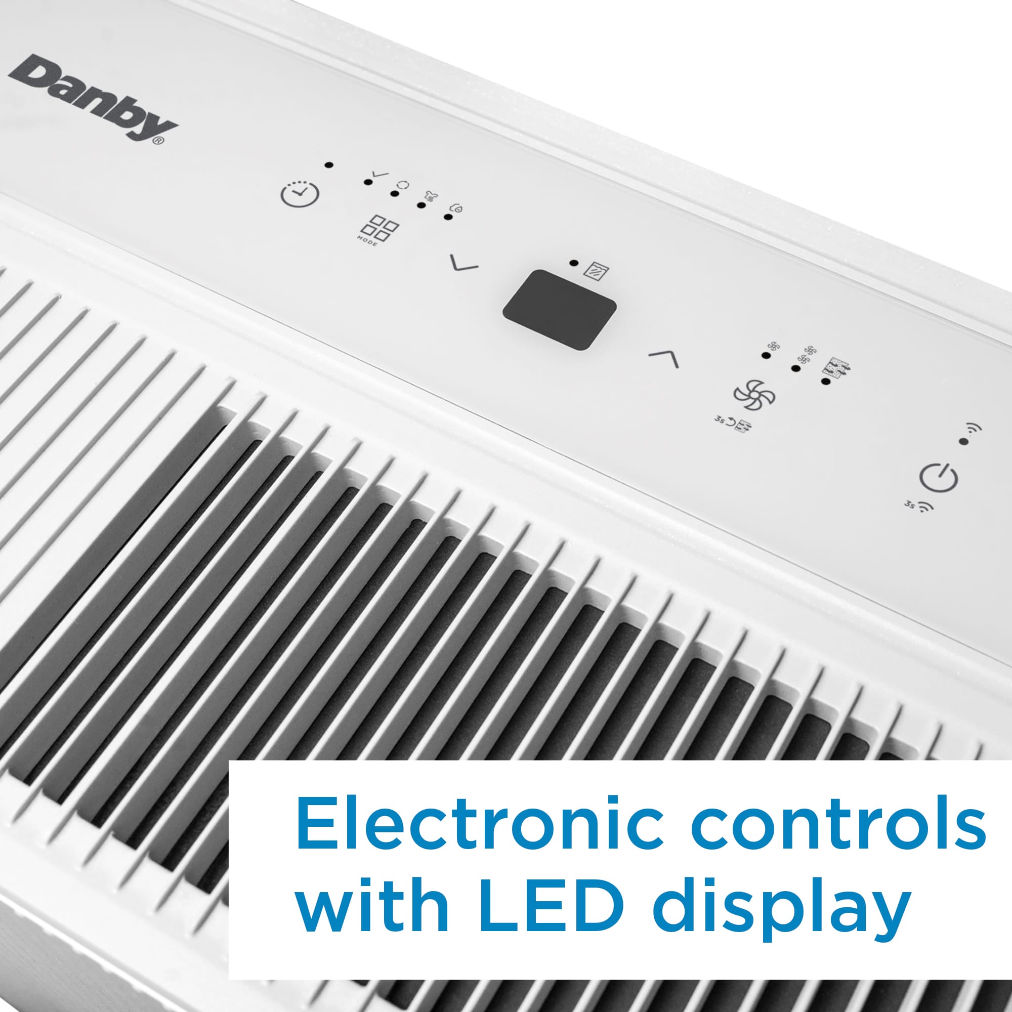 Efficiently reduce moisture and maintain optimal humidity levels in your home with the Danby 50 Pint White Dehumidifier with Wi-Fi. Designed for areas up to 3,000 sq. ft., this ENERGY STAR® certified unit removes up to 23.6 liters of moisture daily while operating quietly at just 49 dB. Stay in control wherever you are with built-in Wi-Fi and an app-based bucket full indicator. Customize performance with a two-speed fan, and enjoy continuous draining via the direct drain feature. With Smart Dehumidify technology, the unit automatically adjusts humidity based on ambient temperature. Equipped with user-friendly electronic controls, LED display, a 24-hour timer, auto restart, and a reusable filter, this portable dehumidifier is a smart and efficient solution for any home.