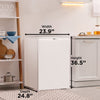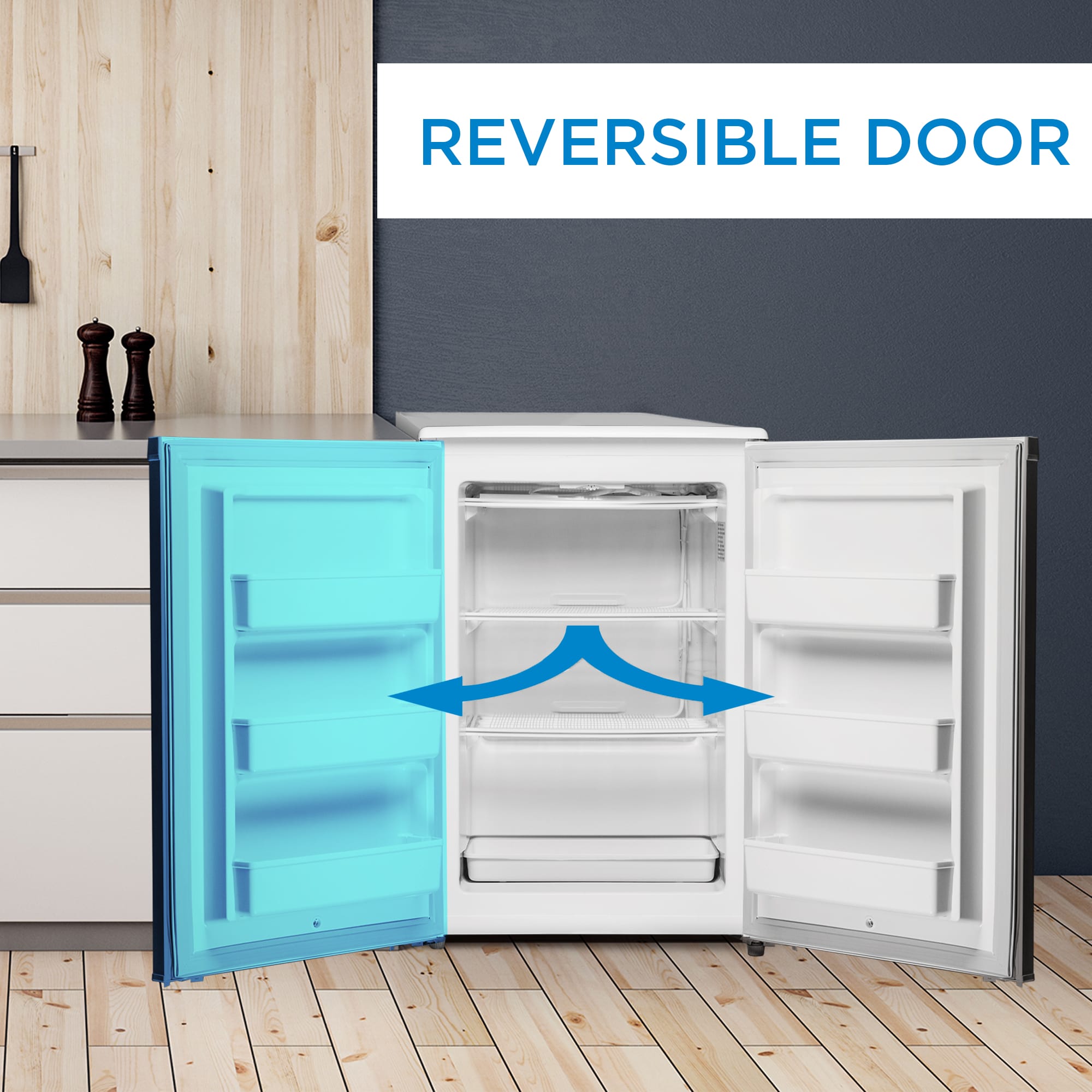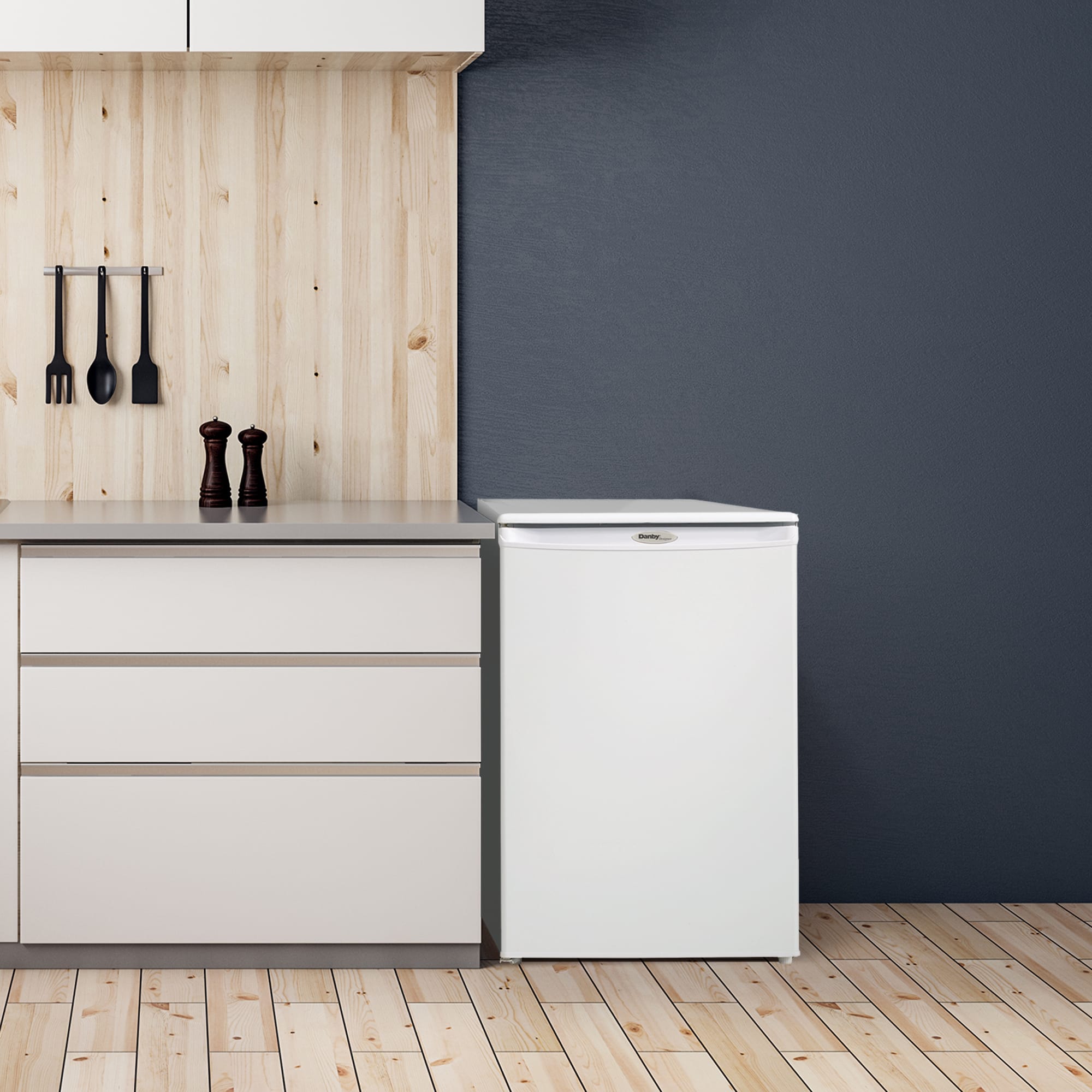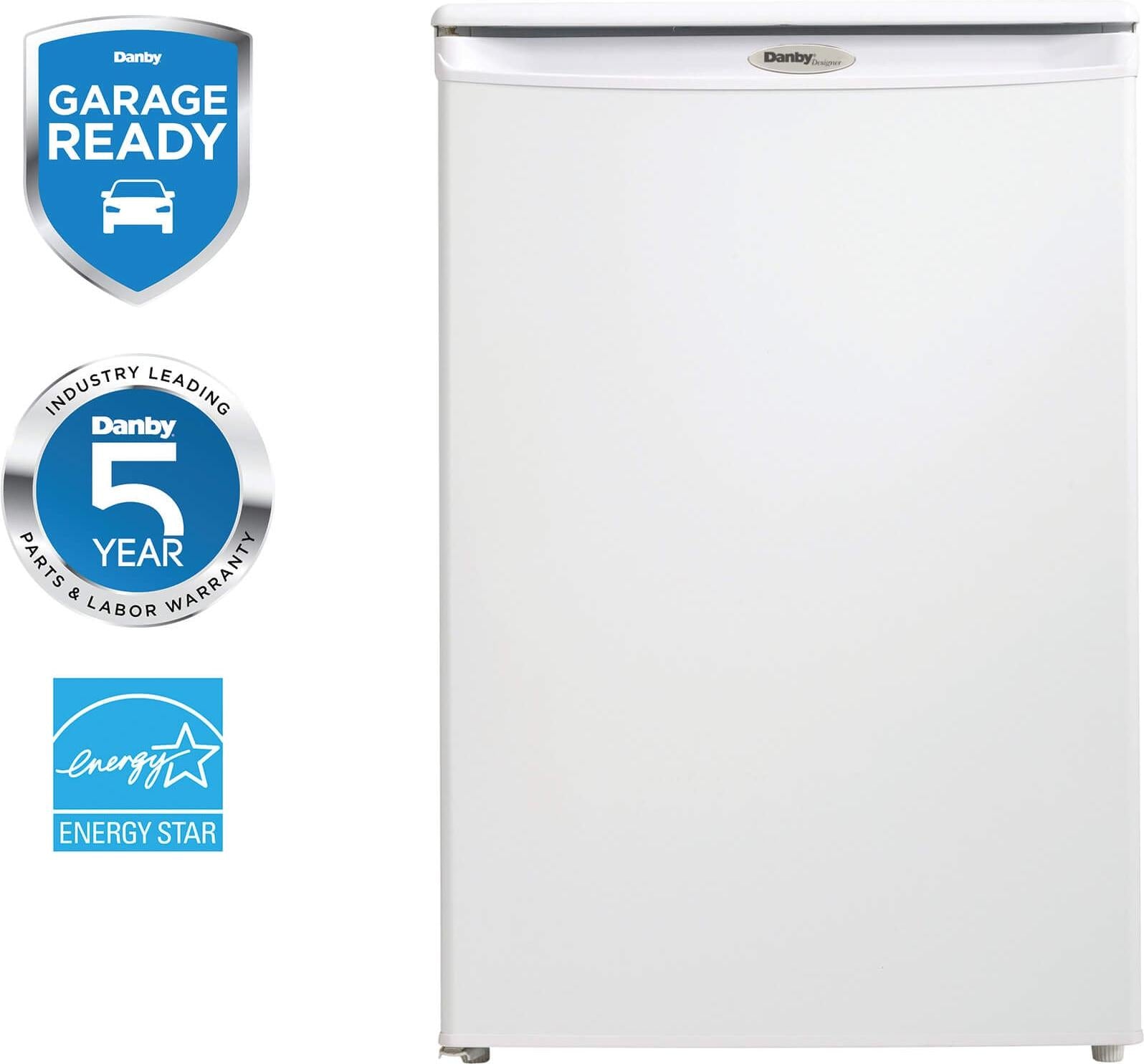 The Danby Designer 4.3 cu. ft. Upright Freezer is a space-efficient and energy-conscious solution for small living areas such as condos, apartments, trailers, or cottages. With a generous 4.3 cu. ft. (122 L) capacity, this ENERGY STAR® certified freezer helps reduce energy consumption without sacrificing performance. Organizing your frozen items is easy with three quick-freeze shelves and integrated door shelving. The freezer operates with a reliable manual defrost system and a user-friendly mechanical thermostat. Designed with a scratch-resistant worktop, reversible door hinge, and smooth back for flush installation, this garage-ready unit is built to perform in temperatures from 0°F to 110°F. Backed by a 5-year in-home warranty, it delivers long-term value and dependable freezing in any setting.