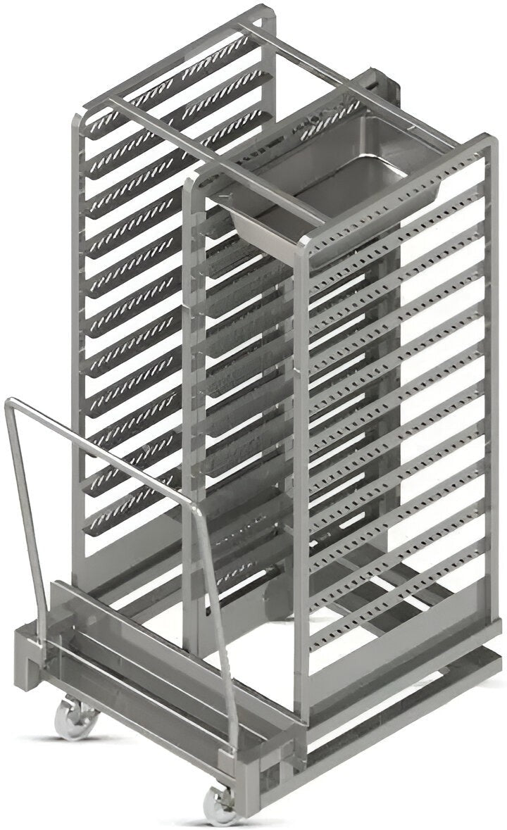 - Even Heat Distribution: The open structure of the rack allows for optimal air circulation around each pan during rethermalization and holding, ensuring even heat distribution. This design minimizes cold spots and ensures that every dish reaches the desired temperature, maintaining food quality and consistency. Even heating is crucial in large-scale operations where maintaining consistent food temperature is essential for safety and satisfaction.