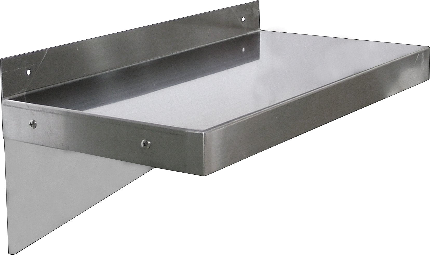 This shelf is made of 18 gauge 430 stainless steel. The shelf is supported by two triangular brackets.