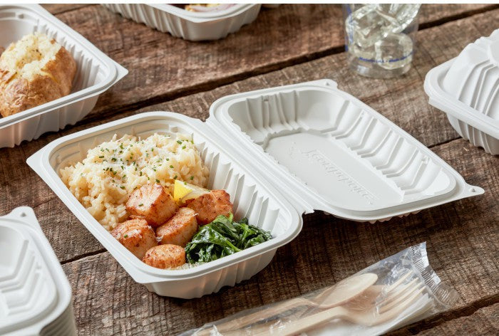 Pactiv Evergreen - 9 x 6 x 2.7" White, Vented MFPP Hinged Lid Container, 170/cs - YCNW0207