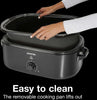 The Proctor Silex Commercial 18 Qt Black Electric Roaster Oven is a versatile and efficient appliance designed to meet the demands of both commercial kitchens and home entertaining. With its generous 18-quart capacity, it can accommodate a whole turkey up to 24 pounds, making it ideal for large gatherings, holiday meals, and special events. This roaster oven offers multiple cooking functions, including roasting, baking, slow cooking, steaming, and warming, providing flexibility for various culinary needs. The adjustable temperature control ranges from 125°F to 450°F, allowing precise cooking for a variety of dishes. Its removable enamel-coated cooking pan and lift-out rack ensure easy cleanup and convenient handling of large meats. The durable stainless steel construction and cool-touch handles enhance safety and longevity, while the domed lid design helps retain moisture and heat for optimal cooking results. Whether you're preparing a family dinner or catering an event, this electric roaster oven delivers consistent performance and ample capacity.
