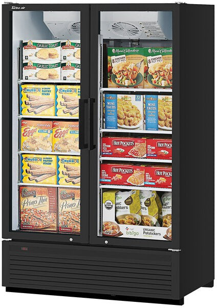 The Turbo Air 51.8" Heavy Duty Black 2 Swing Glass Merchandiser Door Freezer is a powerful and reliable solution for showcasing and preserving your frozen food products. This commercial-grade freezer is built to withstand the rigors of heavy-duty use in demanding environments.