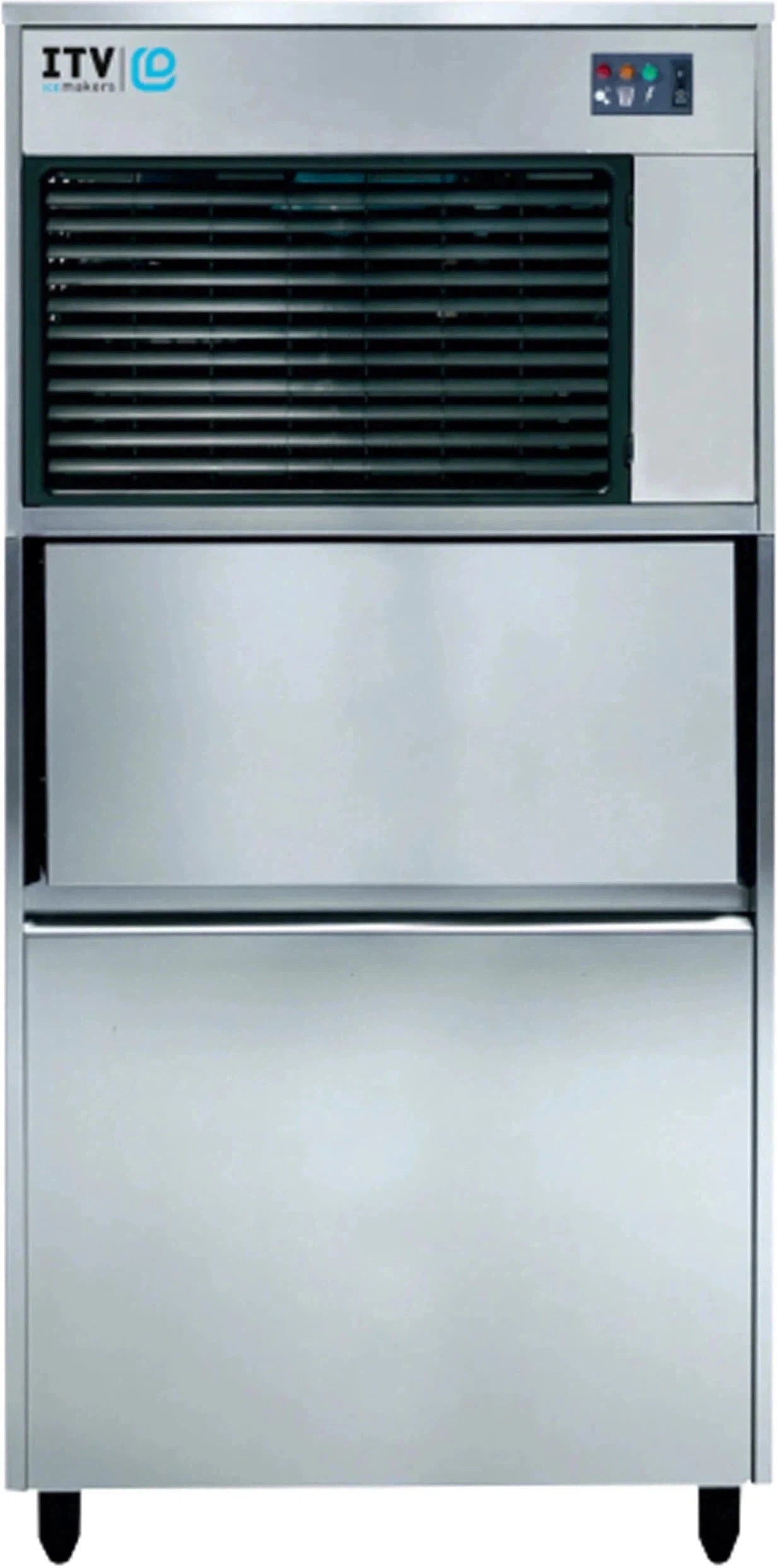 The ITV Ice Makers IQ 300C Modular Granular/Flaker Ice Machine With Built-in Bin. This machine produces wet granular ice and features the most efficient evaporator on the market, resulting in lower energy consumption and higher ice production. With an evaporator without gaskets or seals and a stainless steel auger with a resilient coating, this machine is built to last. The powerful speed reducer on top ensures smooth operation, while the AISI 304 stainless steel body guarantees durability and hygiene. The machine is equipped with an electromechanical control system and an on/off lighted rocker switch on the front panel for easy operation. Ice drops out through the opening on the bottom of the unit, and the machine is tropicalized (Class T), making it suitable for a wide range of environments