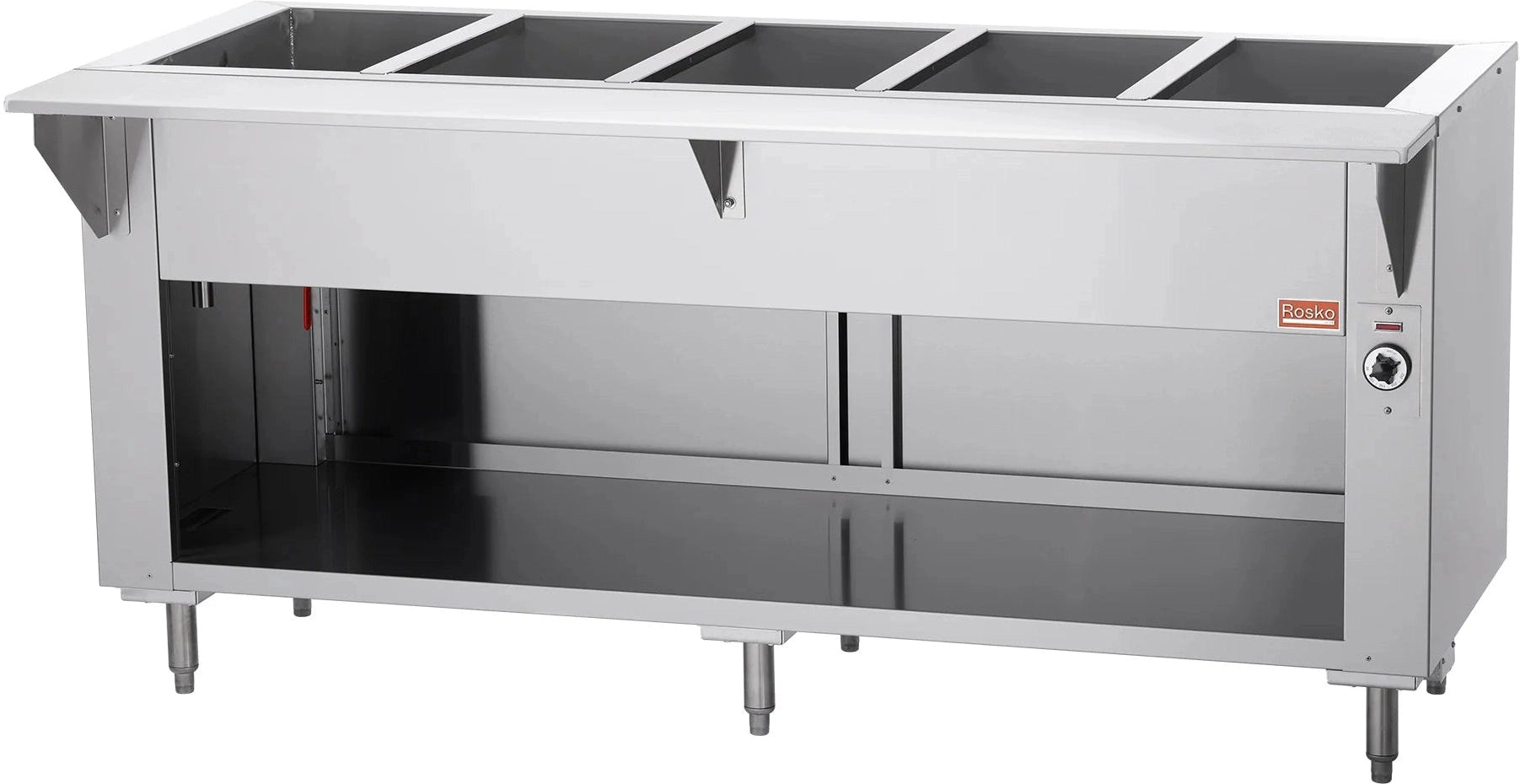 Introducing the Rosko stainless steel electric floor steam table, a versatile and efficient solution for keeping a large quantity of food warm and ready for service in commercial kitchens, banquet halls, or catering events. With its spacious 72-inch size, this floor steam table provides an extensive surface area for holding multiple food pans, ensuring that your dishes are maintained at the optimal serving temperature. Powered by a robust 5,000-watt heating element and compatible with 240-volt electrical systems, this steam table offers quick heating and precise temperature control.