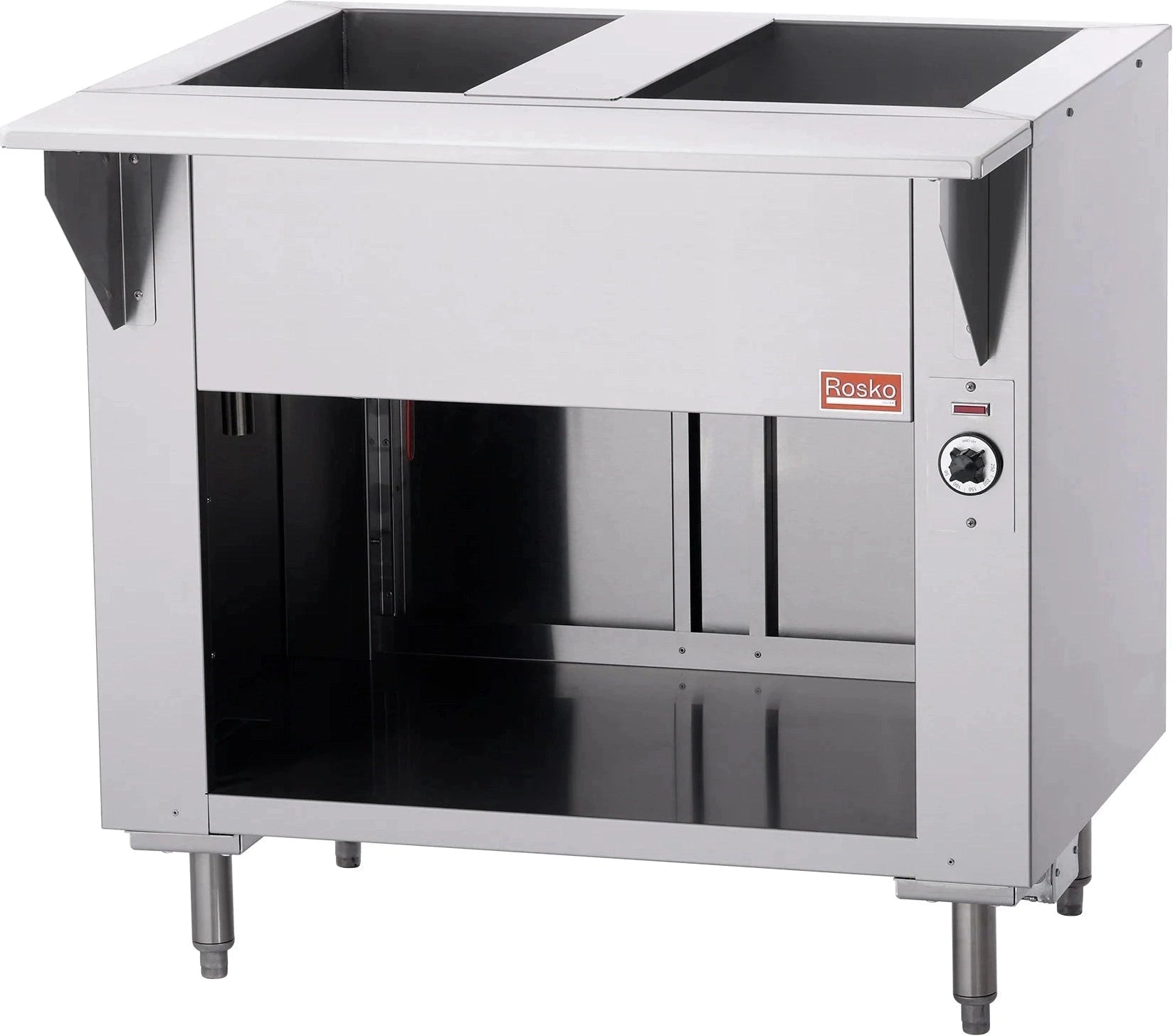 Introducing the Rosko stainless steel electric floor steam table, a reliable and efficient solution for keeping food warm and ready for service in commercial kitchens or buffet setups. With a spacious 36-inch size, this floor steam table provides ample space for holding a variety of food pans, keeping them at the ideal serving temperature. Powered by a robust 2,500-watt heating element and compatible with 240-volt electrical systems, this steam table ensures quick heating and precise temperature control.