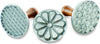 Imprint your cookies with lovely, intricate designs using these heavy cast aluminum stamps. Heirloom quality with three designs and wooden handles. Scallop, criss-cross and floral designs.