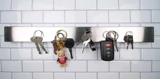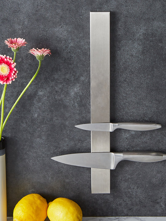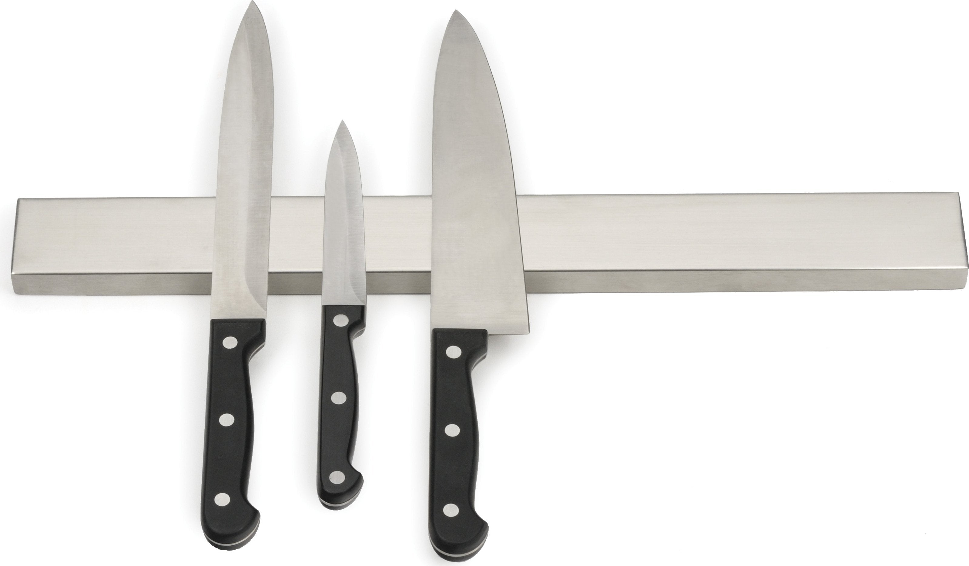 Keep knives, scissors and other tools conveniently within reach. This 17.75″ holder has a strong, full surface magnet that holds items securely, and the 18/8 stainless steel satin finish complements many kitchen styles. Includes mounting hardware.