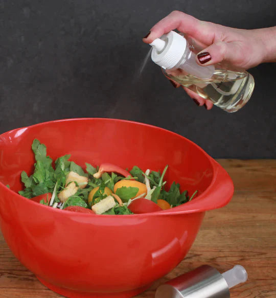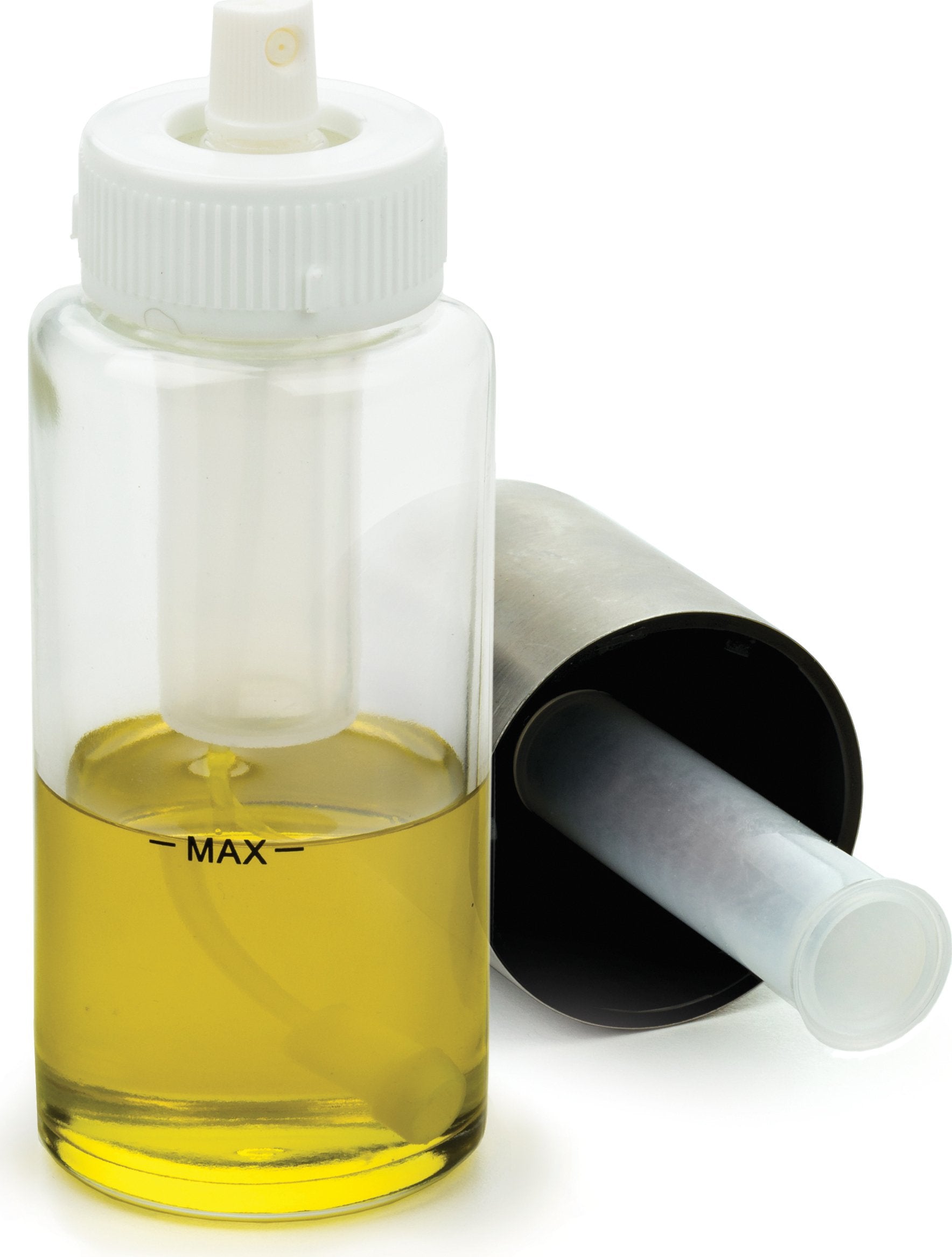 Our non-aerosol pump-style oil mister is ideal to use when a light spray of oil is desired on meat, fish, and vegetables or to lightly oil cookware for nonstick convenience. Works with oils, seasoned oils and most vinegars. Glass jar holds 4 oz. when filled to the “MAX” line. Lid is stainless steel with plastic interior parts. All parts are dishwasher safe on the top rack.