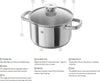 Set includes: Saucepan with lid 1.5 L / 1.6Qt., Sauce Pot with lid 2 L / 2.1 Qt., Sauce Pot with lid 2.8 L / 3 Qt., Sauce Pot with lid 3.6 L / 3.8 Qt., Stock Pot with lid 6.2 L / 6.6 Qt., Fry Pan 9.5" / 24 cm, and Steamer Insert 8" / 20 cm (Fits 2.8 L & 3.6 L).
