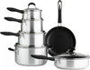This set includes: 1 qt saucepan with cover, 2 qt saucepan with cover, 3 qt saucepan with cover, 3 qt sauté pan with cover, 6 qt saucepot with cover and the 10” skillet.