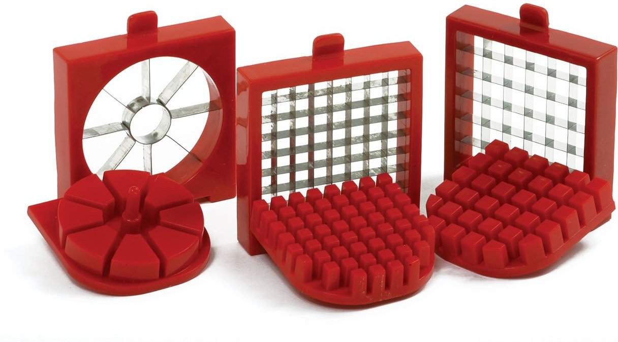 Fry up french fries restaurant style, without going out. The suction base keeps the cutter stable while in use. Includes two stainless steel cutters with 36 and 64 holes and an eight segment fruit wedger. Efficiently slice uniformly thick or thin french fries with one simple move. Fruit wedger easily cores and slices uniform sections. Handwashing recommended.