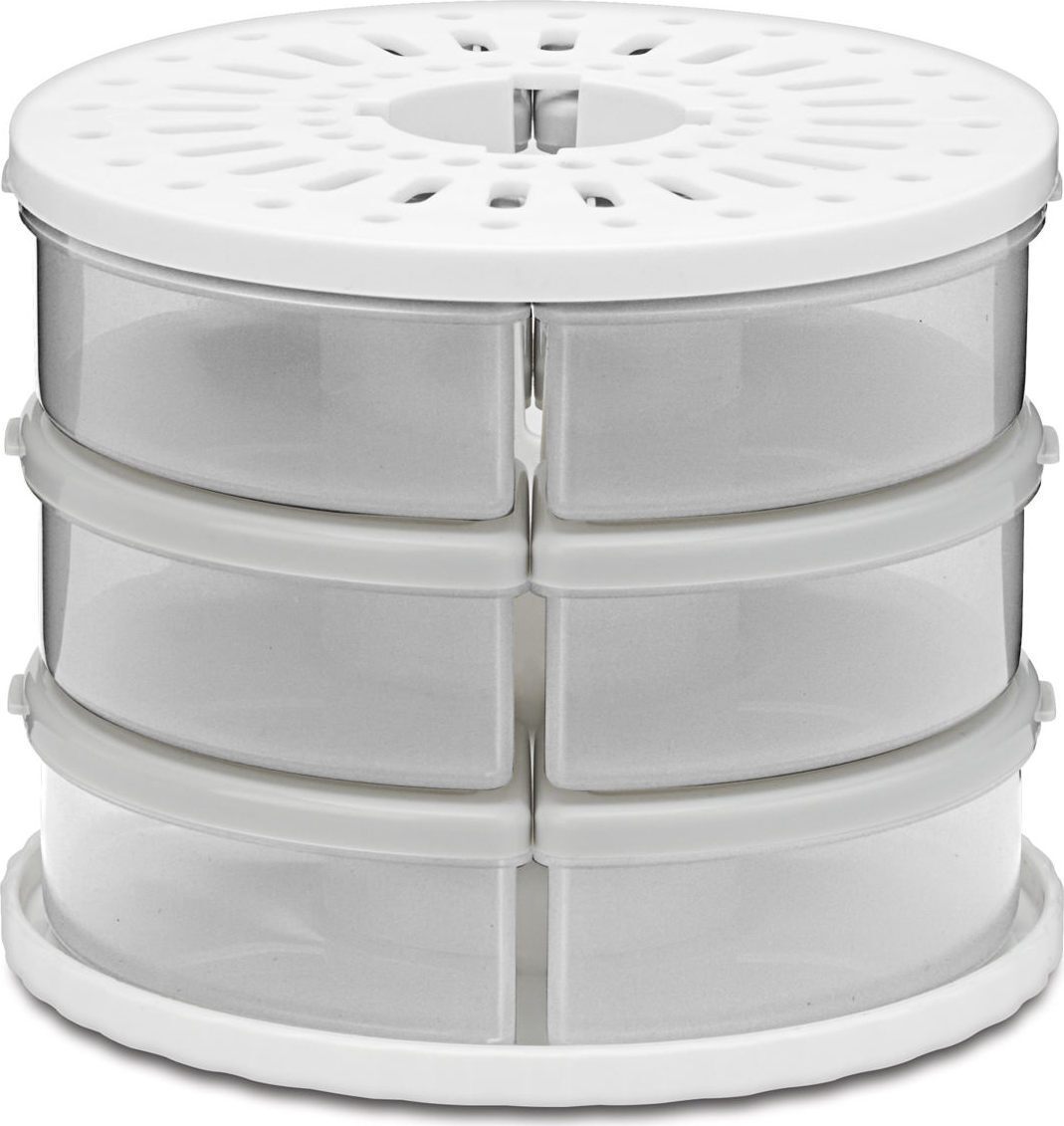 - Containers stack easily on top of each other, economizing space wherever you store them