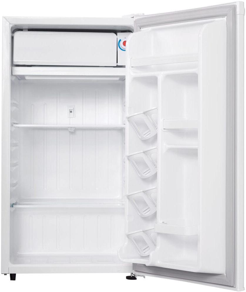 Perfect for dorms, bedrooms, offices, or lunchrooms, the Danby Designer 3.2 cu. ft. White Compact Fridge combines compact design with convenient features. It includes a full-width freezer section, Danby’s patented CanStor® beverage dispenser, and molded egg storage to keep essentials organized. Adjustable glass shelves and integrated door shelving with tall bottle space ensure flexible storage. With its ENERGY STAR® certification and sleek white finish, this compact refrigerator offers energy-efficient performance and modern utility. The reversible door hinge and smooth back design make it a great fit in any small space.