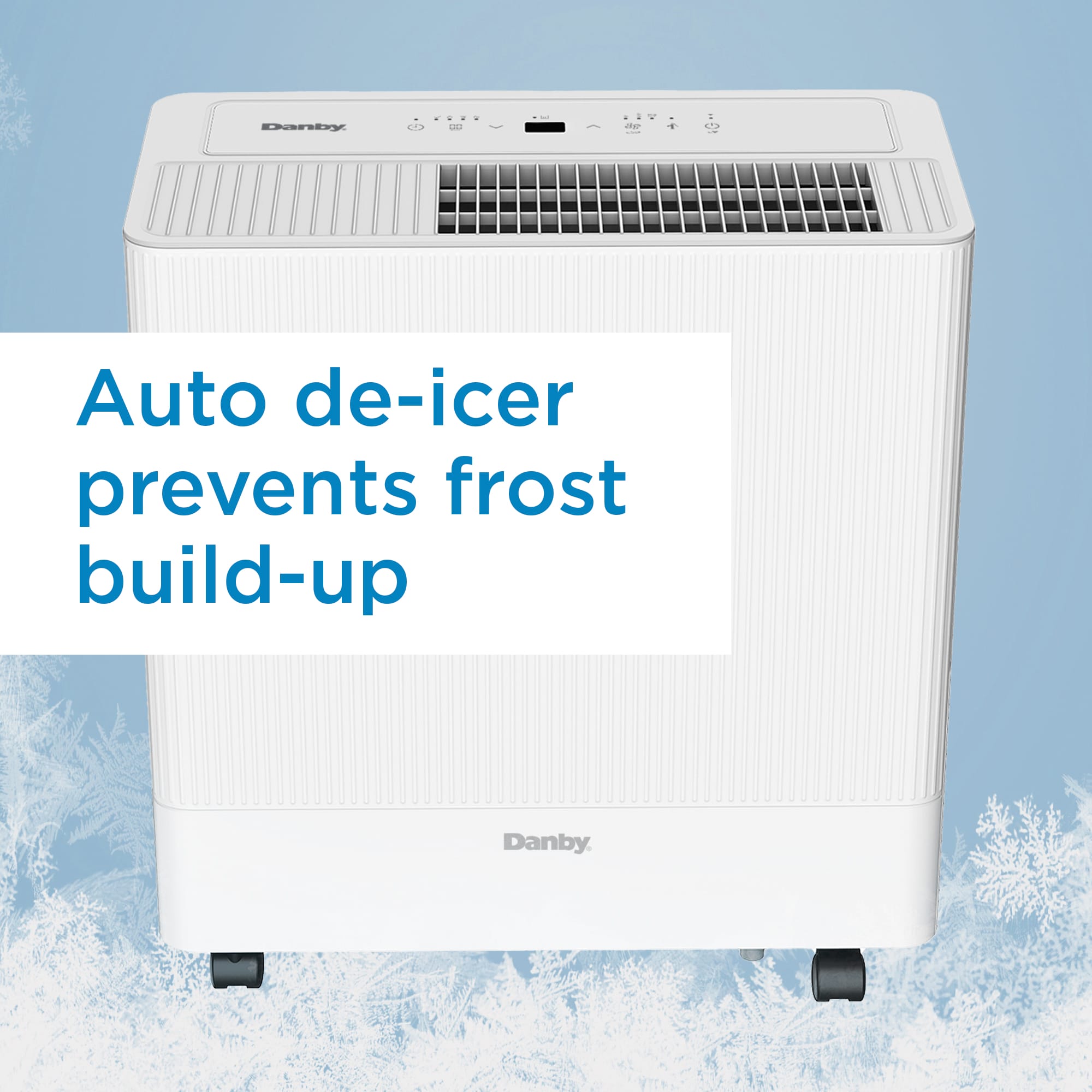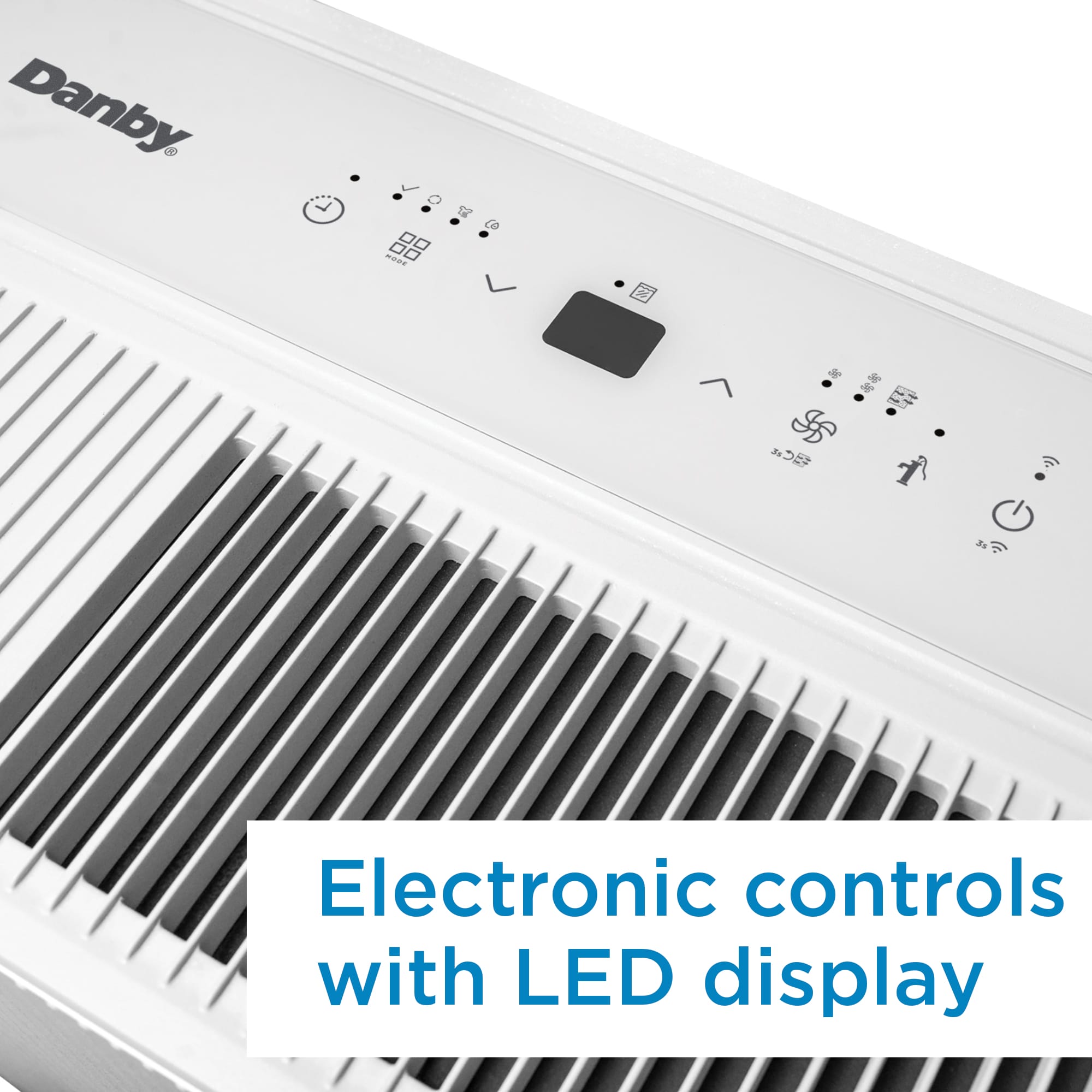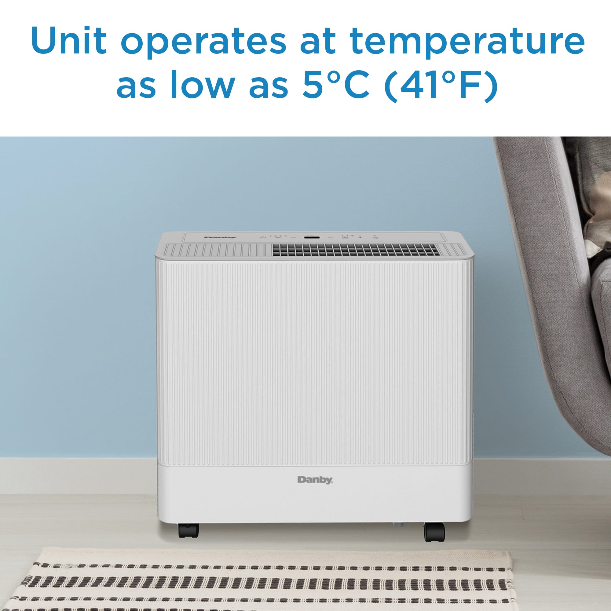 Manage your home’s humidity effortlessly with the Danby 50 Pint White Dehumidifier with Pump and Wi-Fi. Perfect for spaces up to 3,000 sq. ft., this ENERGY STAR® certified unit removes up to 23.6 liters of moisture per day and features a Wi-Fi Connect function, allowing you to monitor performance and receive bucket full alerts directly from the app. Designed for quiet operation at just 49 dB, it includes an upgraded vertical pump and direct drain feature for continuous draining. With Smart Dehumidify, electronic controls, and an LED display, staying in control is simple and efficient. Plus, enjoy peace of mind with a 2-year parts and labor warranty.