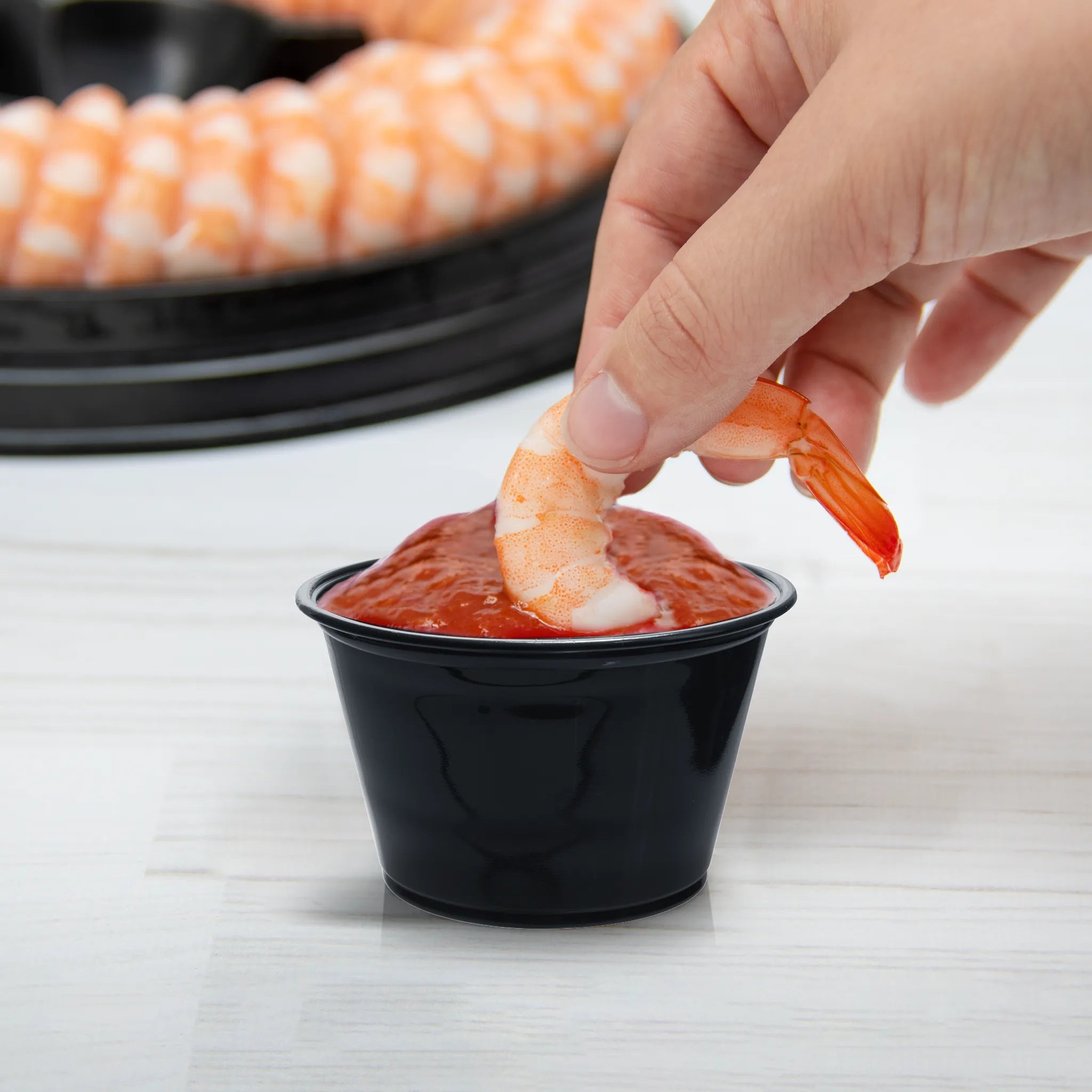 The Dart Container - Conex Compliments Translucent 4 Oz Black Plastic Portion Cups, available in a case of 2500 (400PCBLK), are versatile and reliable food service containers designed by the reputable brand DART. These portion cups are an essential solution for various applications, offering a capacity of 4 ounce. Constructed from durable polypropylene material, these cups are designed to be medium-weight, striking a balance between sturdiness and flexibility. The clear color of the cups provides excellent visibility, allowing for easy identification of contents, which is particularly beneficial in food service environments. The cups are uncoated and unlined, ensuring that the original taste and quality of the contents remain uncompromised.