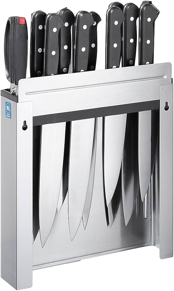 Keep your knives safe, sanitary, and organized with the Edlund 10-Slot Enclosed Stainless Steel Knife Rack with an Open Back. Designed for commercial kitchens, this knife rack provides a secure storage solution that is safer than magnetic knife racks. The open-back design allows for airflow and easy access, while the 12" long skirt adds extra protection in busy environments. Best of all, it won’t dull your knives, ensuring they stay sharp for longer.