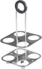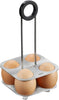 Two adjustable stainless steel plates hold four eggs sized S to XL safely in the pot while boiling. When they are done, just take the eggs out, move the upper plate down onto the lower one, put the eggs back and serve them! The stylish combination of stainless steel and the black plastic of the ring-shaped handle makes the egg stand a practical and beautiful table accessory. The egg stand can be used in pots of 12 cm diameter and larger.