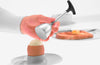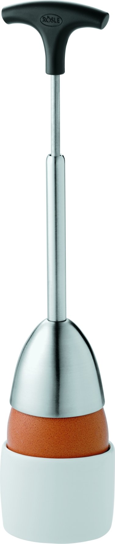 Niftily opens every breakfast egg. Just position, release and lift off the egg shell. Pull handle up & release, spring mechanism causes vibration and the sharp edge in dome perfectly cuts shell. Cleanly cracks the top of the egg shell so that it's easily lifted off by hand or with a knife. Produces no fragments. Manufactured from 18/10 stainless steel and synthetic material.
