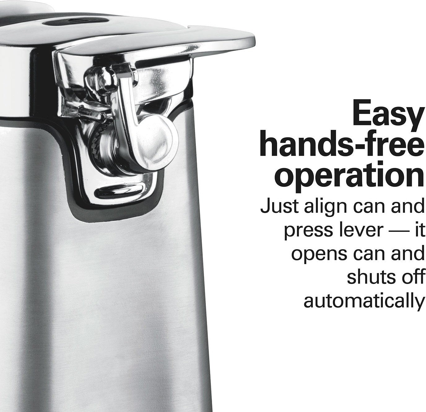 - Hands-Free Operation: Operates hands-free with automatic shutoff. Simply align the can and press the lever; the can opener does the rest and shuts off automatically once the can is opened.