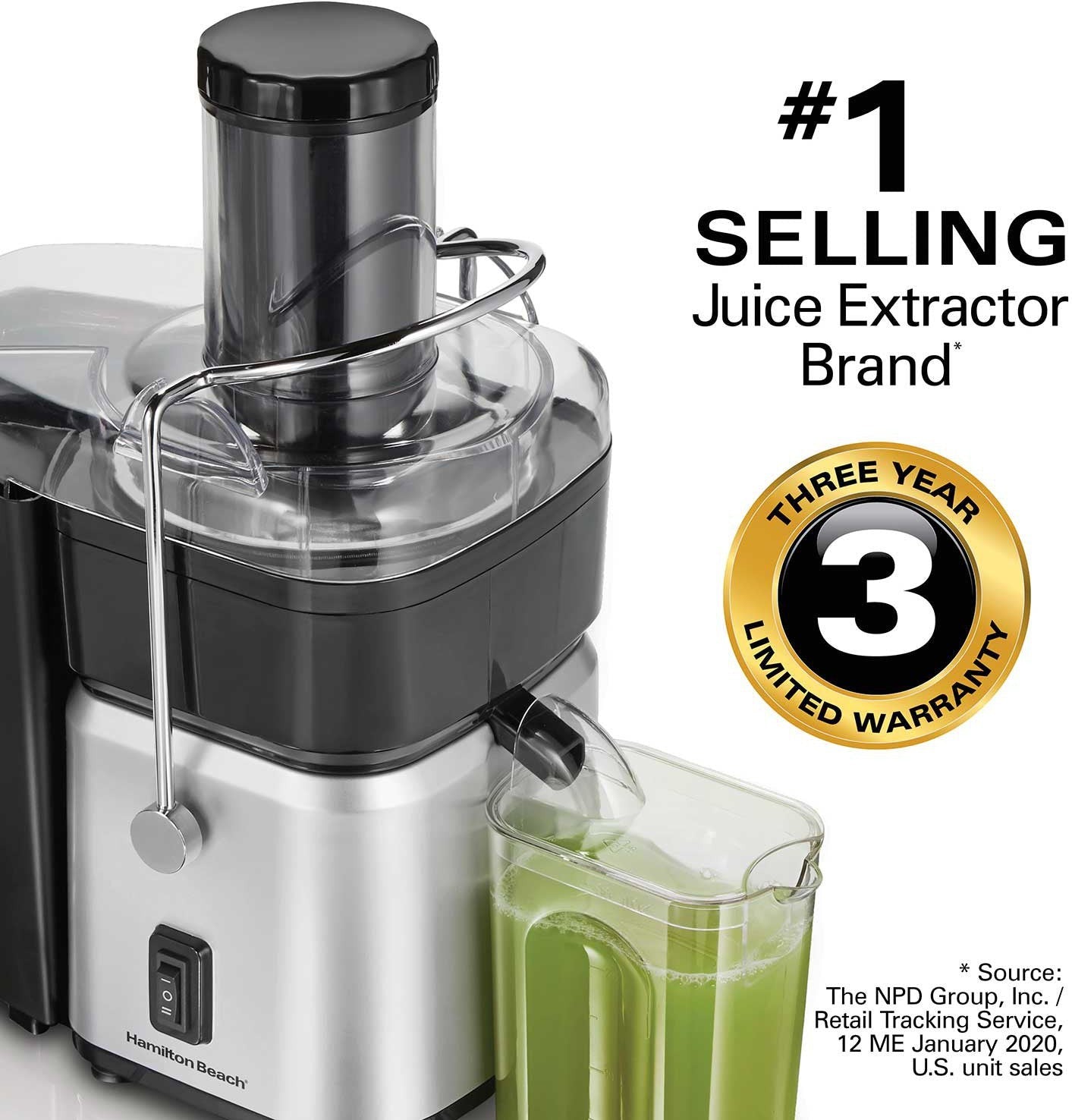 Experience the convenience of fresh, nutrient-packed juice with the Hamilton Beach Whole Fruit Juice Extractor. This powerful juicer effortlessly transforms whole fruits and vegetables into delicious juice in seconds, thanks to its robust 700 watt dual-speed motor and an extra-large 3" chute that accommodates whole produce, minimizing prep time. The stainless steel micromesh filter ensures maximum extraction of juice from both hard and soft produce, while effectively straining away pulp and seeds for smooth, flavorful results. Enjoy foam-free juice with the integrated froth separator, which ensures a clear pour every time. The BPA-free 30 oz. pitcher holds ample juice for your needs. Cleanup is a breeze with dishwasher-safe parts, including the pitcher, lid, micromesh filter, and pulp bin. A dedicated strainer cleaning brush is included for thorough maintenance after each use. Backed by Hamilton Beach, a leading brand in juice extractors, this model comes with a reassuring 3-year limited warranty, providing peace of mind for your investment.