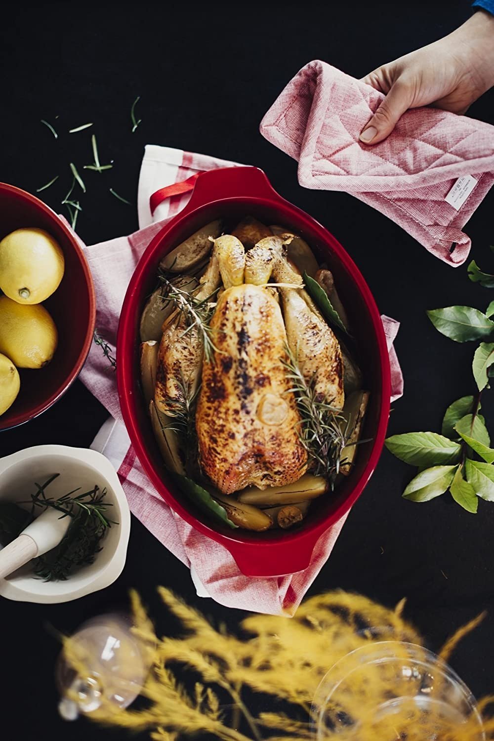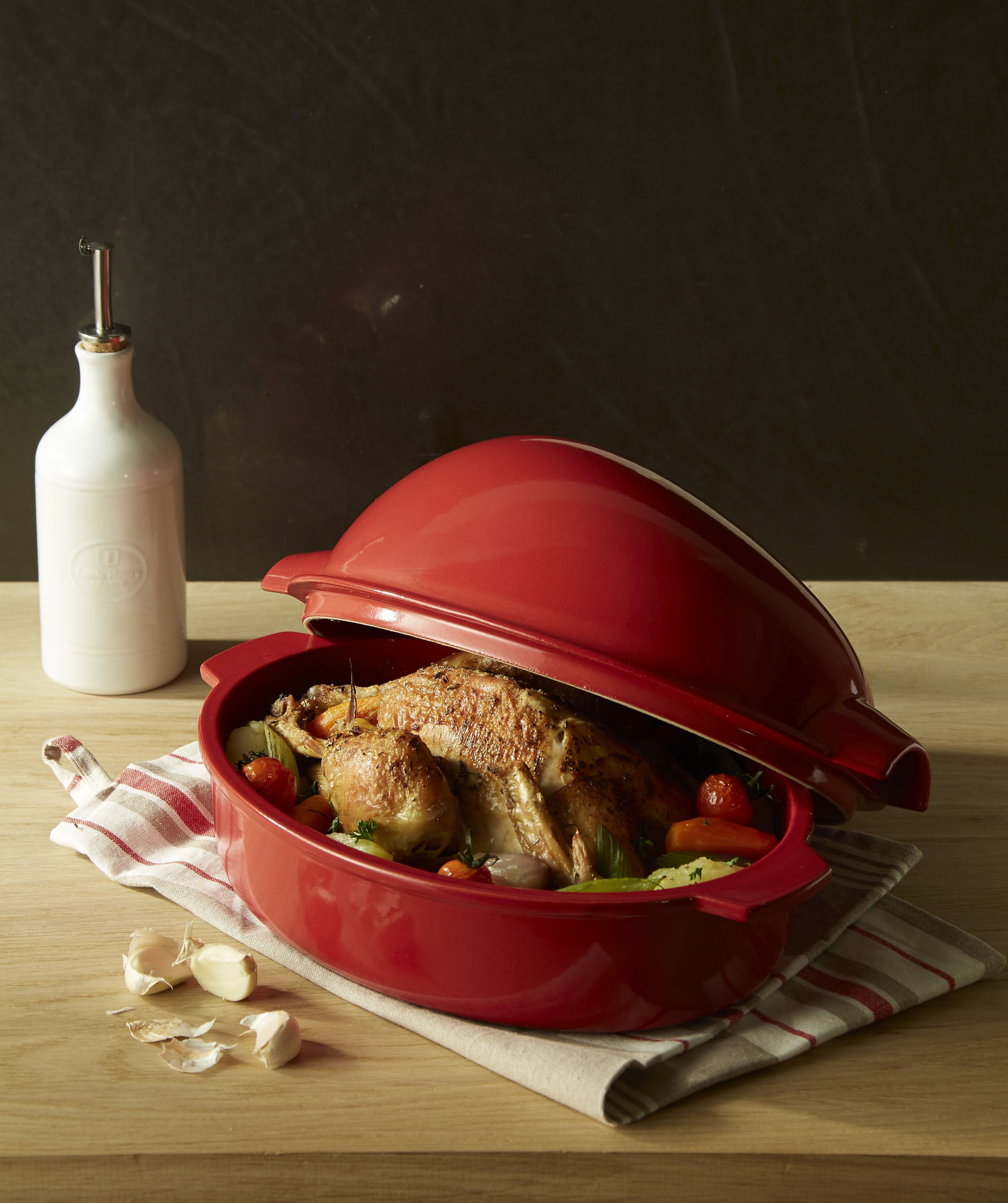 The unique Emile Henry Chicken Baker delivers tender meat and perfectly cooked vegetables with no messy splatters. Thanks to a lid that accommodates a chicken or a roast, steam circulates around the ingredients to self baste. Plus, ridges on the base elevate meat from oily juices. Add vegetables directly to the base for delicious results! An ideal way to cook meat for excellent results, thanks to Emile Henry's proprietary HR Ceramic and the unusual shape of the Baker.