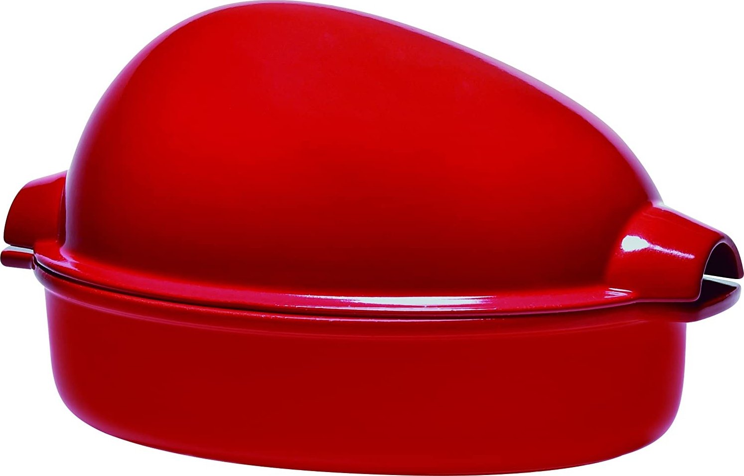 NEW larger size! The best way to cook poultry and roasted meat, while keeping your oven clean. Its unique shape diffuses the heat evenly, to get tender, moist flesh with a crispy skin. No need to baste the meat during cooking, the steam circulates naturally thanks to the lid. Place your chicken in the Roaster then add chopped vegetables or potatoes around the sides: the meat will be moist and the vegetables succulent!