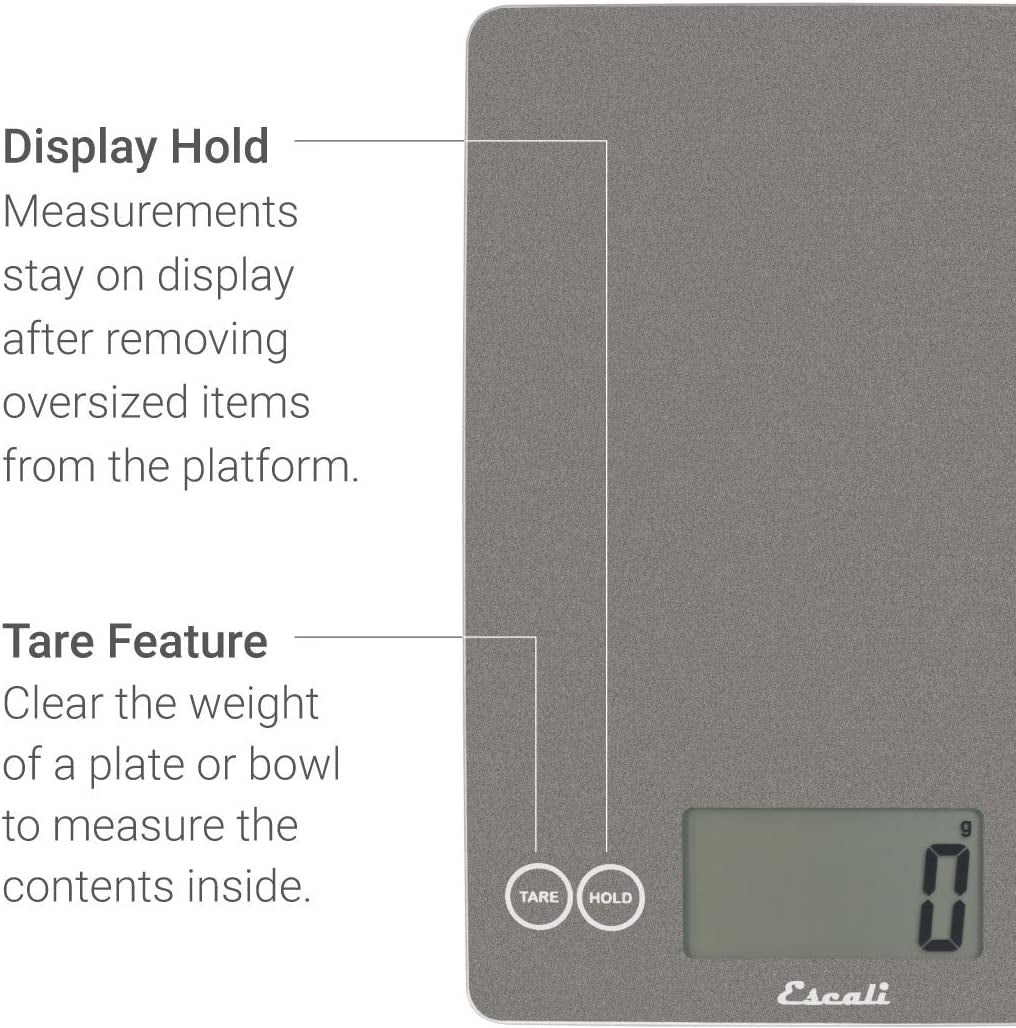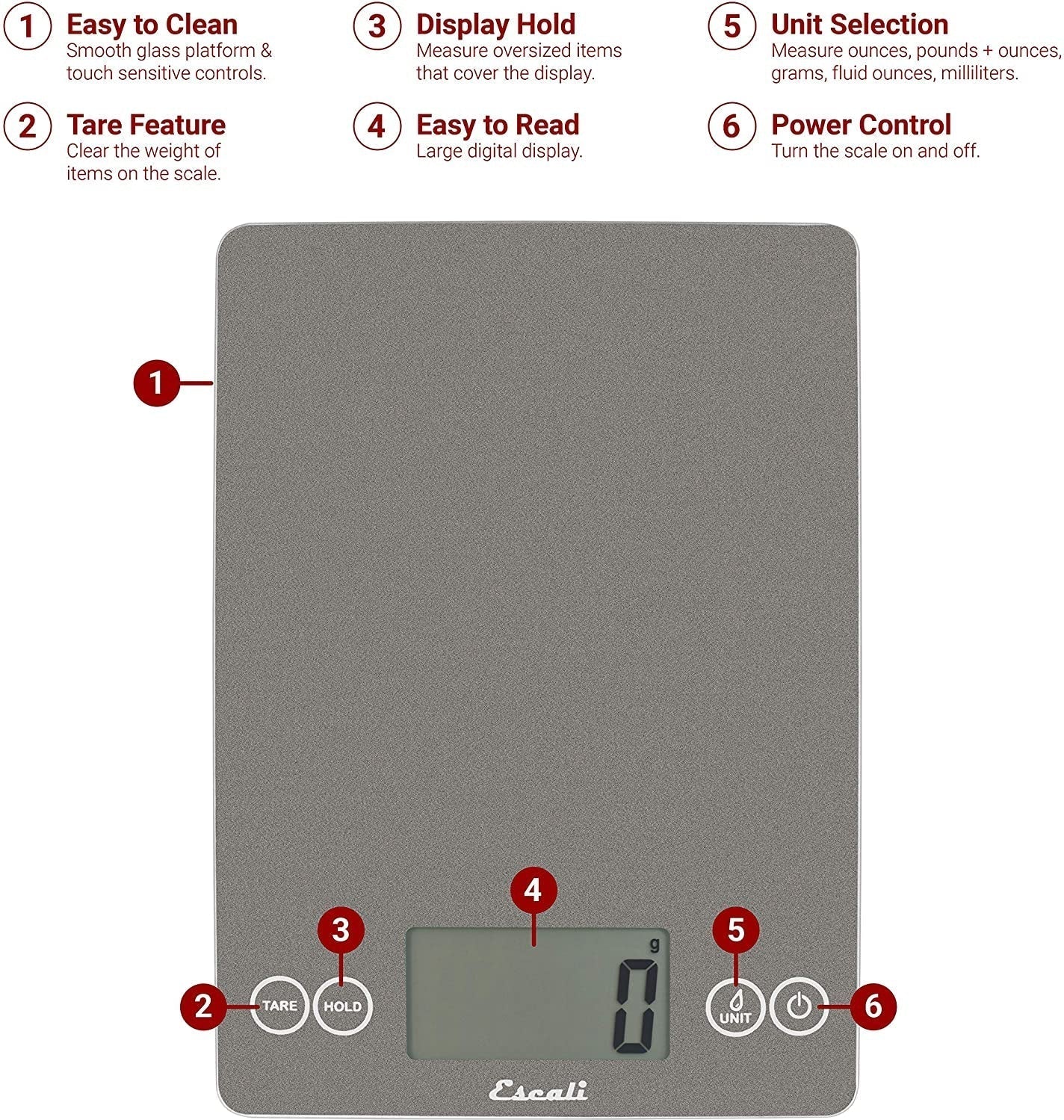 The Escali Arti Glass Kitchen Scale has quickly become a fan favorite among both novice home cooks and professional chefs alike. With its sleek and modern design and simple, touch-sensitive controls, the Arti is the perfect kitchen tool for anyone who wants to measure ingredients with precision. Its accuracy of up to 1 gram or 0.1 ounces means that your recipes will come out perfectly every time, and its 15-pound weight capacity makes it ideal for even the largest recipes. Whether you're just starting out in the kitchen or you're a seasoned pro, the Escali Arti Kitchen Scale is an essential tool for perfecting your favorite recipes. The luxurious shimmer of the metallic color was inspired by the natural beauty of America's Desert Southwest. The touch-sensitive controls create a single, smooth glass surface that is easy to keep clean. Measures both liquid (fl oz, ml) and dry ingredients (g, oz, lb + oz). Hold weight measurements on the screen when weighing large items, even after they are removed from the scale. Reset the scale to zero weight to measure multiple items or subtract the weight of a container. The scale will turn off after five minutes of inactivity to help conserve and extend battery life.