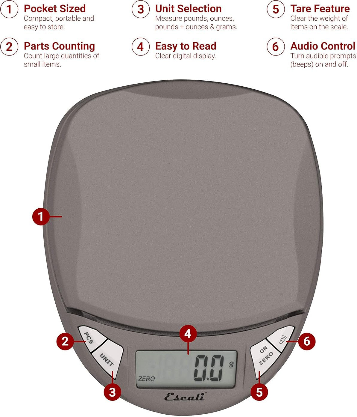 The Escali Pico High Precision Digital Scale is an ultra-sensitive, ultra-portable hand-held scale that measures with increments of 0.005 ounces or 0.1 grams. The Parts Counting function will allow you to count large quantities of small items, and the Display Hold feature will allow you to see measurements when a tray or plate is blocking the view of the display. The ultra-compact design is easy to store away and very travel-friendly. Hold weight measurements on the screen when weighing large items, even after they are removed from the scale. Count large quantities of small items with the accuracy and speed of a digital scale. Reset the scale to zero weight to measure multiple items or subtract the weight of the container. (50 gram maximum tare.) The scale will turn off after five minutes of inactivity to help conserve and extend battery life.