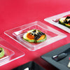 Delight guests as you serve your sweet and savory creations with this Fineline B6200 Tiny Temptations 3" x 3" plastic tiny tray. This heavyweight plastic tray provides the perfect setting for trendy and petite offerings like bite-sized hors d'oeuvres and desserts. Use it for savory bites of sushi or sweet chocolate truffles. The plastic construction is also a convenient, cost-efficient alternative to fine china. Plus, it features a high lip to help prevent anything from sliding off the tray.