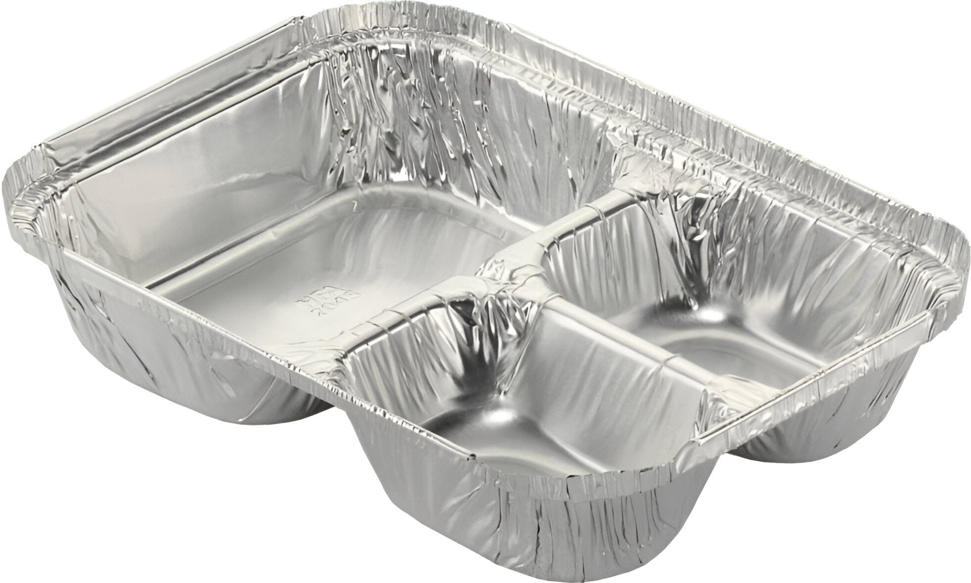 HFA CorporationThree compartment oblong take-out foil pan with foil laminated board lid. The large compartment holds approximately 12 oz , the 2 smaller compartments hold approximately 5.5 oz each. Compartments are separated by a rigid high divider.This pan is also known as the classic TV Dinner Tray, aluminum foil meal trays that were so popular in the 50's and 60's. However, the shape of the containers has evolved into a more modern version compared to the pans from back in the day. They are also ideal for school meal programs, senior feeding, volume feeding, and meals on wheels. HFA Corporation Oblong 3 Compartment Foil Containers – a versatile and practical solution for culinary professionals, catering services, and individuals who seek convenience and organization in their food packaging. This case includes 500 containers, offering a reliable and efficient option for a variety of culinary applications.