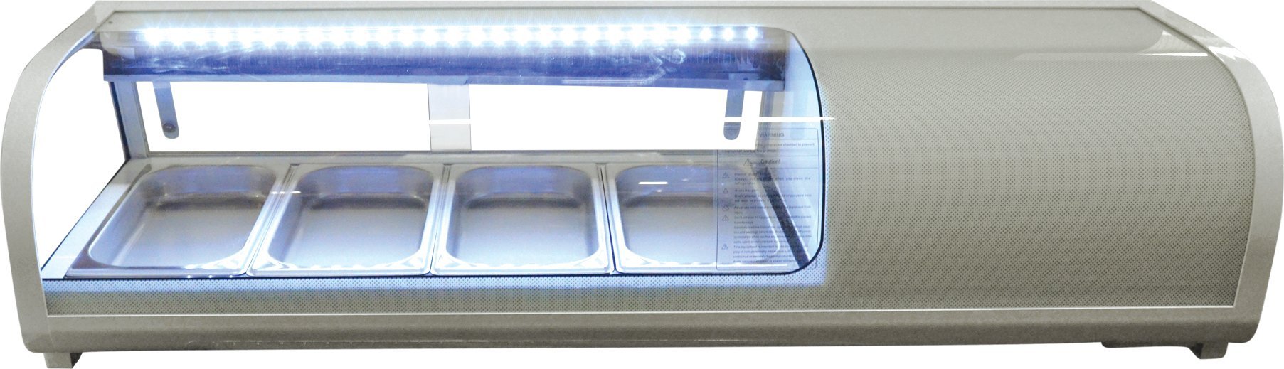 This sushi case is equipped with a high hermetic compressor for efficient condensing with low energy consumption. Designed with an arc-shaped glass to make the food more visible and give the unit a modern and elegant look.