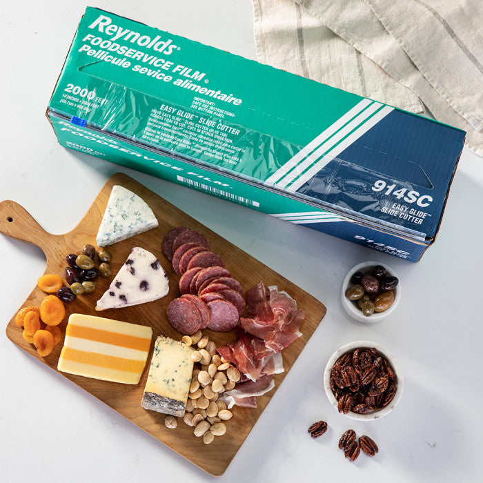 Reynolds plastic film covers, seals, and stores food with ease, keeping it fresh whenever you need it. The PVC film dispenses smoothly and the slider cutter and cutter guard make tearing quick and easy, giving you a straight cut every time and letting you stay efficient behind the counter and in the kitchen.