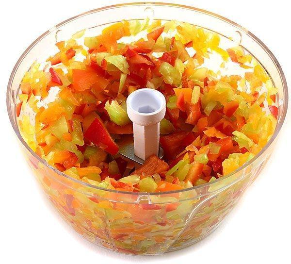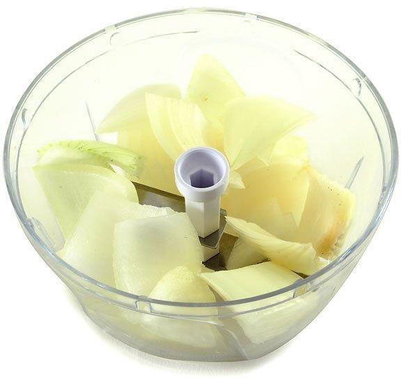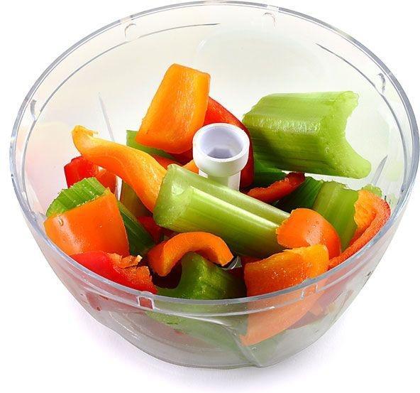Ideal for onions, nuts, garlic, vegetables, fruits & making salsa! Simply pull the cord for quick chopping, mincing and mixing of various ingredients: onion, garlic, chilies, herbs and more! Stainless steel blades cut in both directions and are removable for thorough cleaning. Non-slip base. Helpful hints: cut vegetables, fruits or herbs into smaller pieces and place into the bowl. Caution: Blades are very sharp. Use, clean and store with extra care. Handwashing recommended.