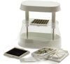Includes 3 interchangeable stainless steel blades: Core, Wedge, Slicing and Dicing. Core/wedge, slice and dice a variety of fruits and vegetables. Large "easy-view" container collects food. Spring loaded for effortless chopping. Store all pieces in compact base for easy storage. Instructions included. Handwashing recommended.