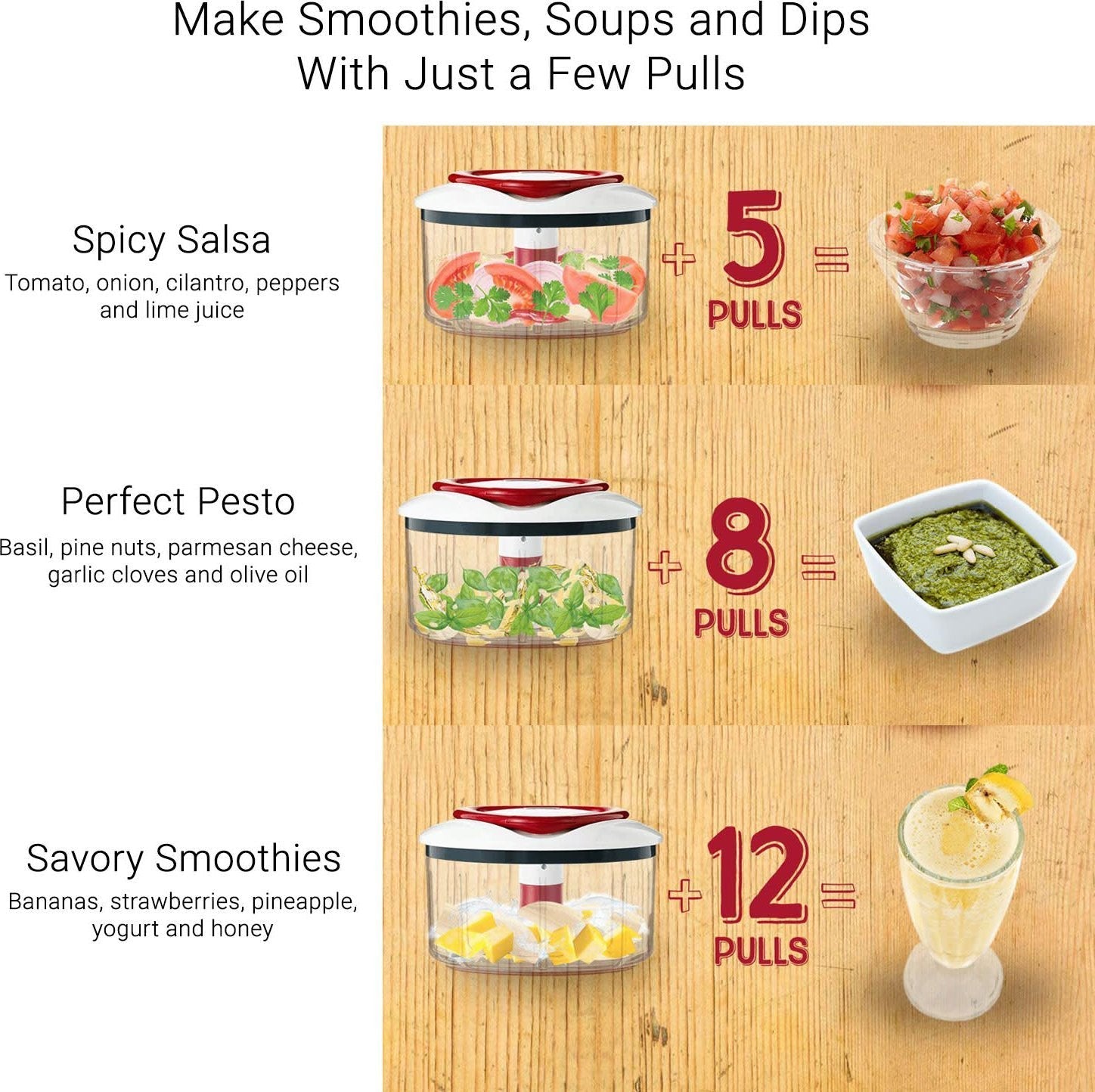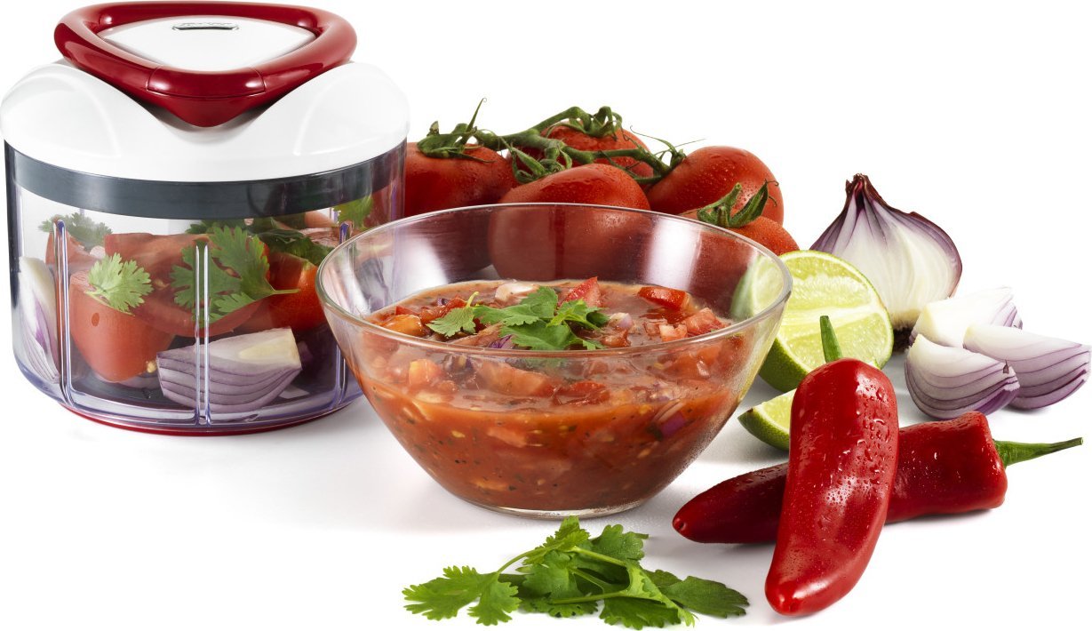 The Zyliss Easy Pull Manual Food Processor and chopper is the ultimate compact food processor and chopper. This versatile tool is ideal for chopping, blending and pureeing ingredients. The patented Swiss design blade cuts through even the toughest foods like carrots and other hard foods. It features a booster arm for even chopping of large and small quantities and a large 25-ounce bowl. Makes great salsa in seconds!